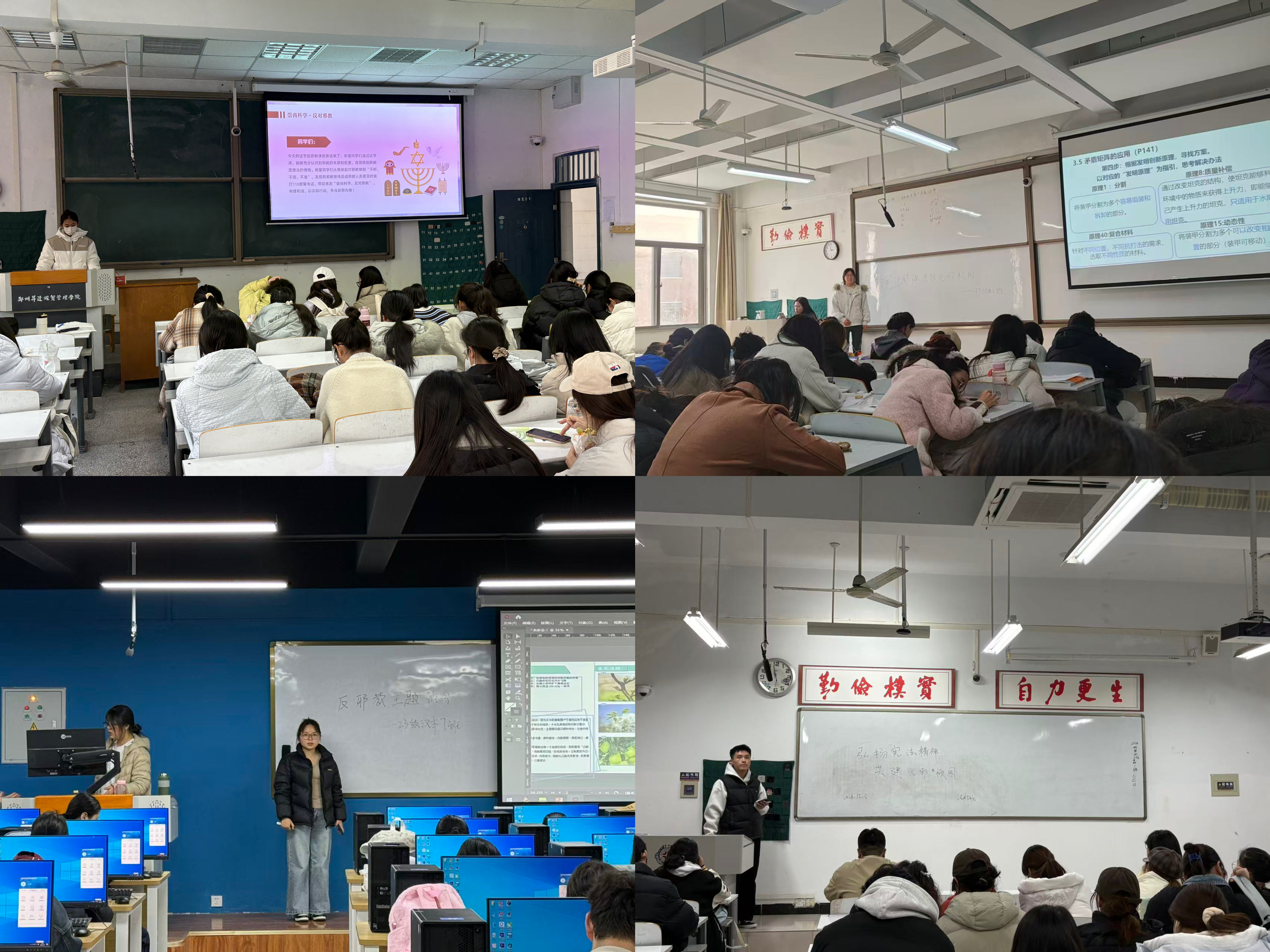 全院各班级召开专题班会,依托PPT、短视频开展宪法与反邪教知识宣讲,结合典型案例区分宗教与邪教界限。通过情景模拟、小组辩论、知识抢答等互动形式激发参与热情,组织学生签署“学法守法、远离邪教”承诺书,部分班级鼓励创作反邪手抄报与法治短句,推动法治理念转化为行动自觉。