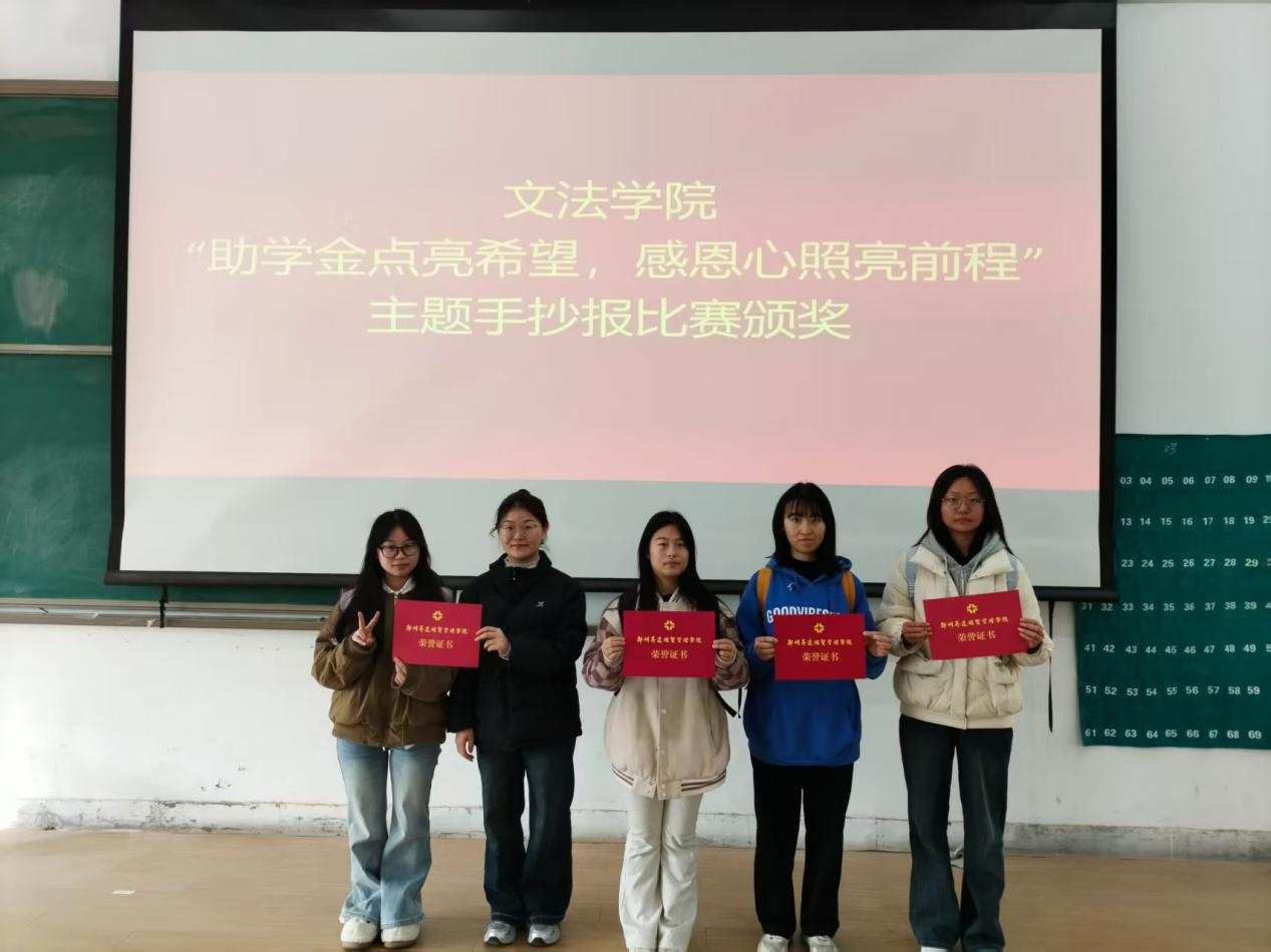 本次比赛以“助学金点亮希望,感恩心照亮前程”为核心主题,旨在通过手抄报这一贴近学生生活的艺术形式,让同学们深刻感受到来自国家、学校和学院的温暖关怀,将感恩之心转化成奋发向上的动力。比赛启动后,各年级、各专业学生踊跃报名,共收到参赛作品87份,作品内容丰富多元,有的生动描绘了助学金为自己学习生活带来的改变,有的深情书写了受助后的成长感悟,有的则以励志故事展现了在资助政策支持下逐梦前行的决心。同学们巧妙地运用色彩搭配和版式设计,将文字与图案有机融合,既兼具思想性与艺术性,又充满青春活力与正能量,充分展现了文法学院学生的创造力与人文素养。