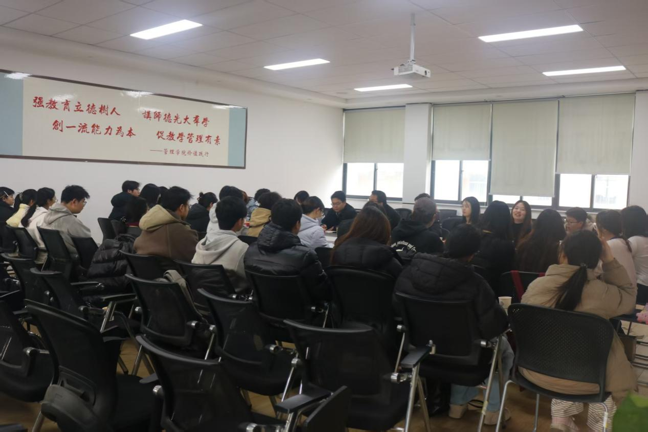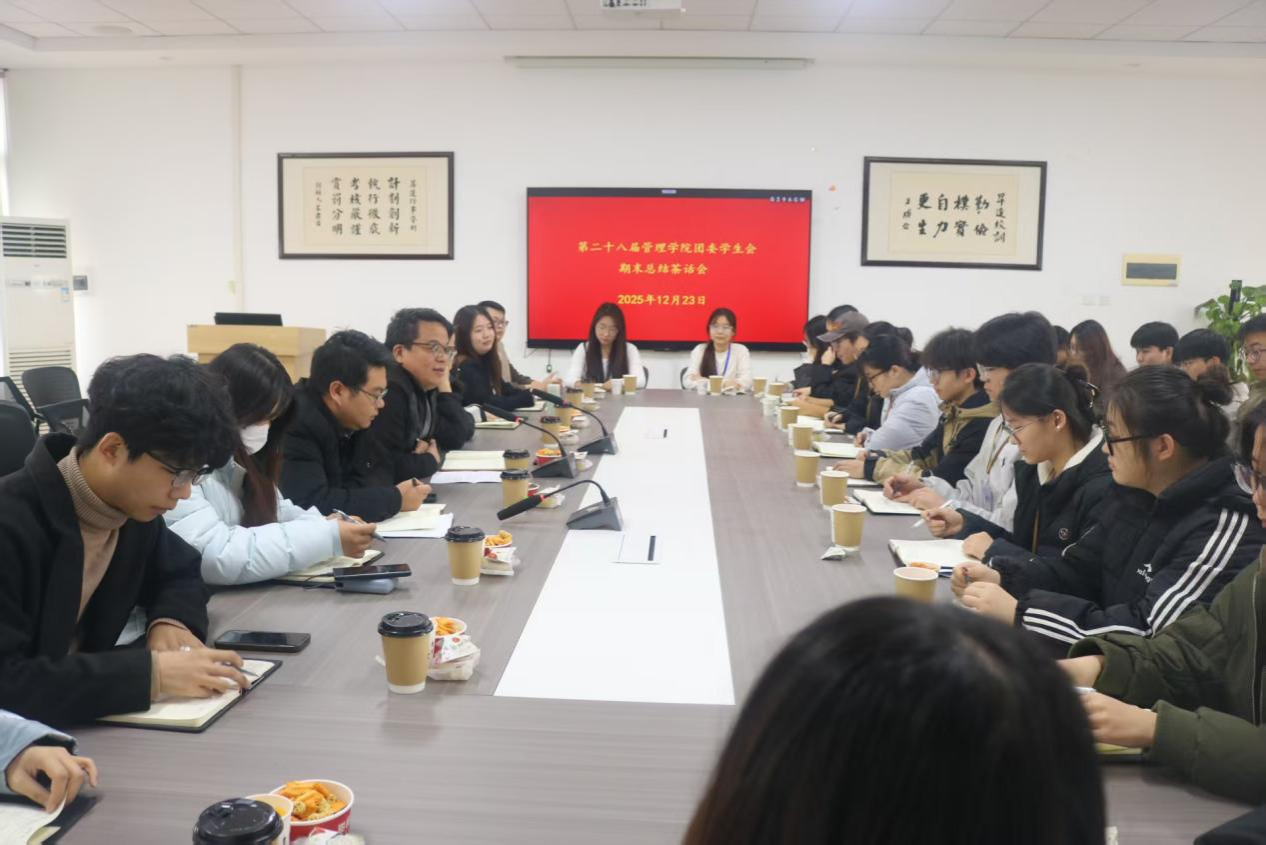 期末将至,为加强团学会各部门之间的沟通协作,总结本学期工作经验,缓解团学会成员们的学业与工作压力,管理学院团学会于2025年12月23日在管理学院教学二号楼209教室举办2025-2026学年第一学期期末总结茶话会。管理学院党委副书记许广庆老师、团委常务副书记马超老师,以及第28届主席团成员、各部门部长与干事代表齐聚一堂,共话成长与发展。