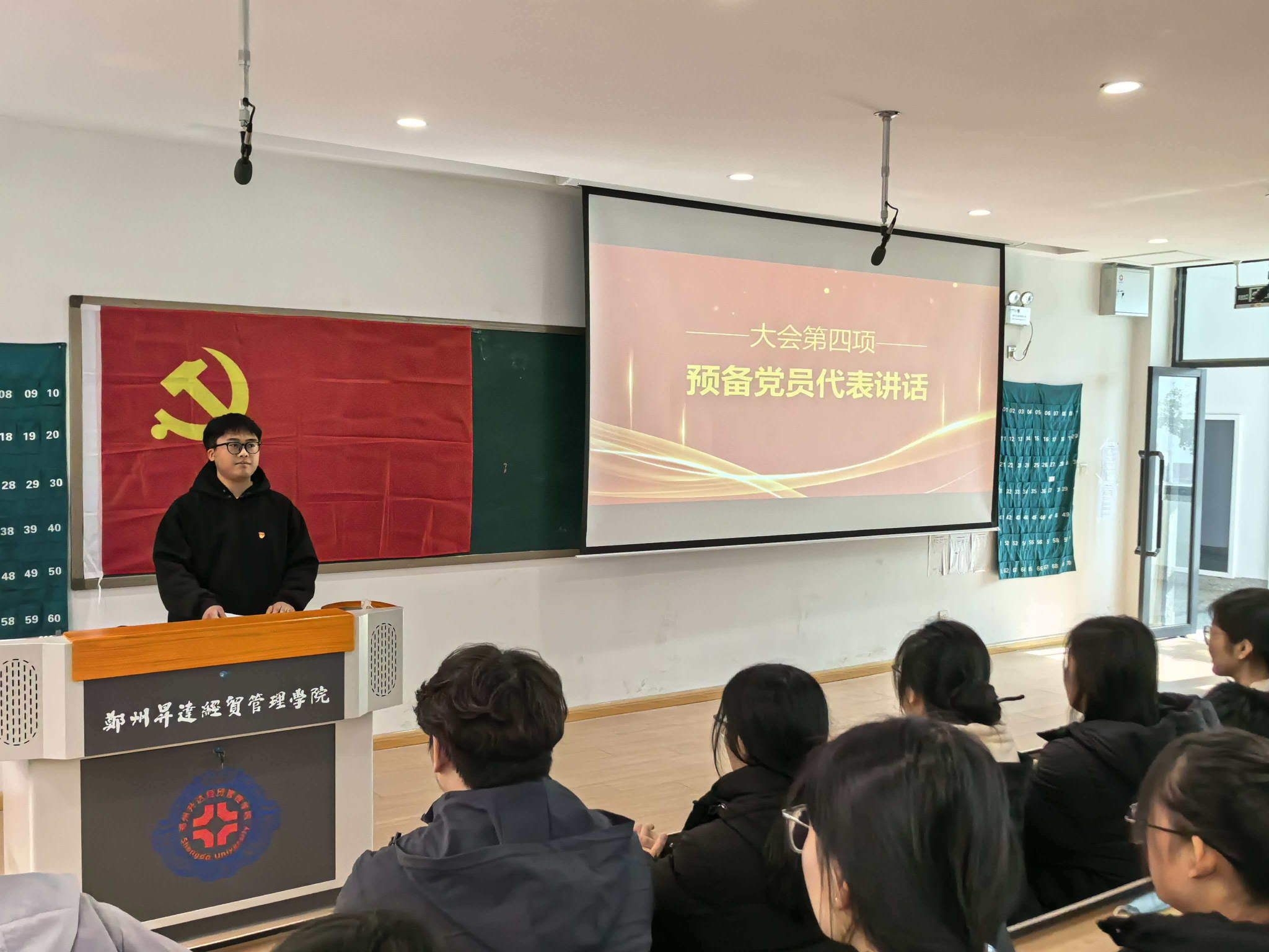 宣誓仪式在庄严的国际歌声中拉开帷幕。主持人宣读了我院2025年新发展党员名单,并对新加入党组织的预备党员表示祝贺。在学生党员代表魏晓柠的带领下,全体党员面向党旗,庄严宣誓,老党员重温入党誓词。预备党员代表李英旭发言,他表示将持续用党的创新理论武装头脑、指导实践;以党员标准严格要求自己,在实践中锤炼党性修养;将持续加强专业学习,以实际行动践行初心使命。