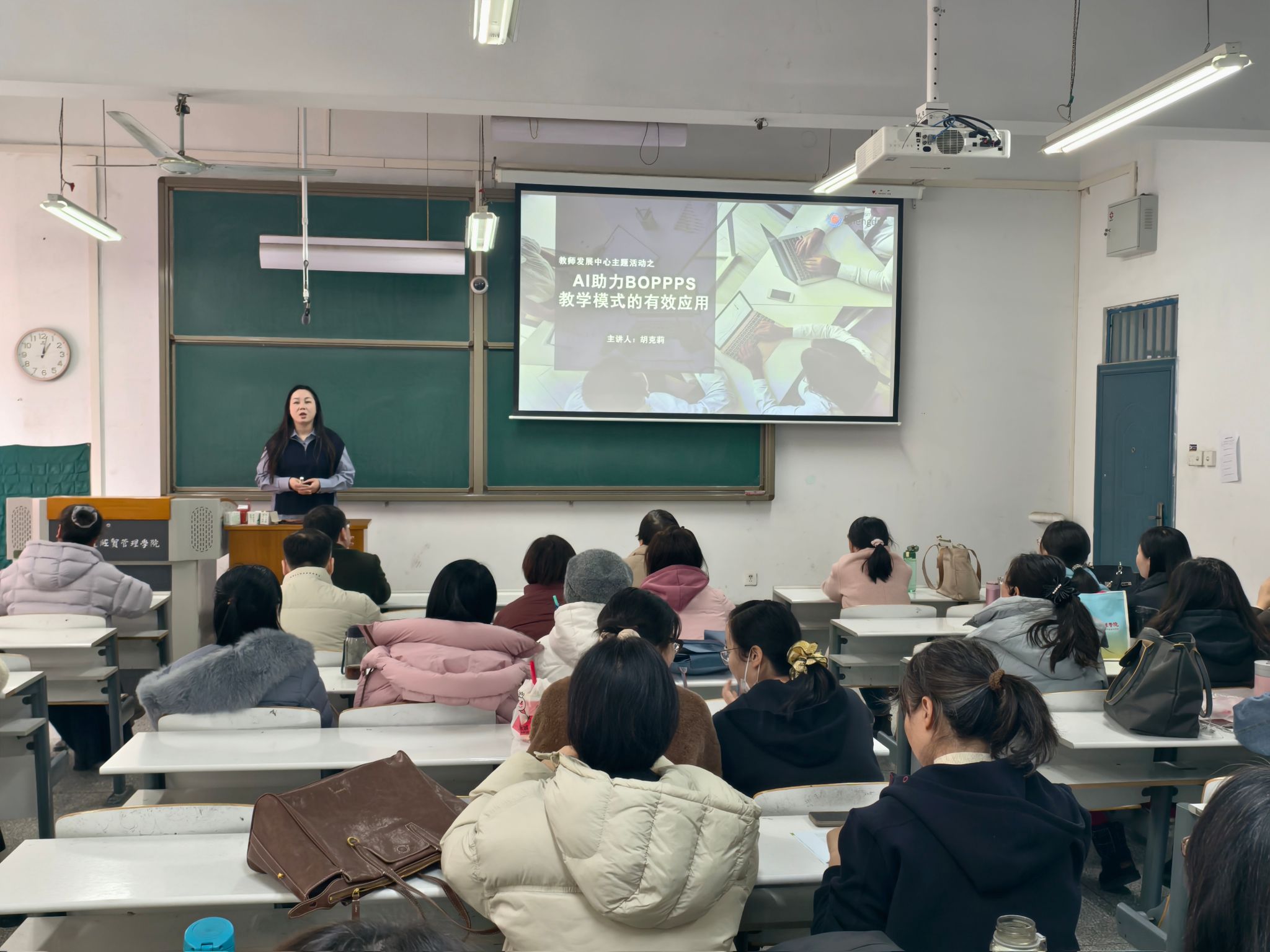 2025年12月18日下午,外国语学院于综合楼331教室成功举办校本培训讲座活动。本次培训由校本培训师胡克莉博士主讲,外国语学院院长王莉莉教授、副院长贺光辉博士莅临指导,大学英语四个教研室全体教师共同参与,聚焦AI助力BOPPPS教学模式的有效应用,为提升大学英语课堂教学质量注入新动能。