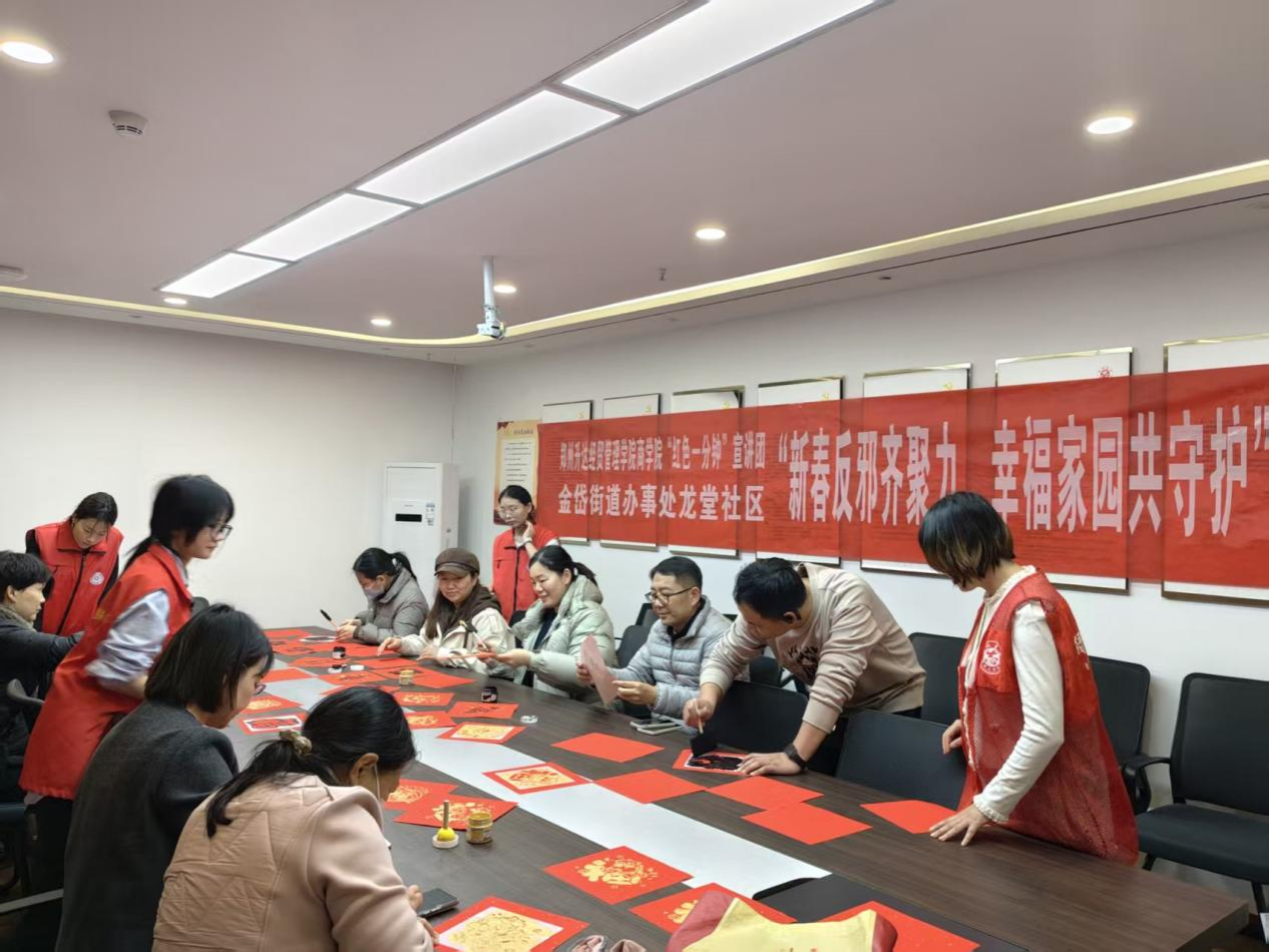 宣讲结束后,充满新春气息的拓印福气活动温馨开启。志愿者们提前备好红纸、墨水和拓印模板,手把手指导和帮助居民们体验拓福工艺,居民们纷纷参与,一幅幅寓意平安吉祥的“福”字跃然纸上。大家一边创作,一边交流反邪感悟,将对美好生活的期盼与拒邪防邪的决心融入纸墨之中。
