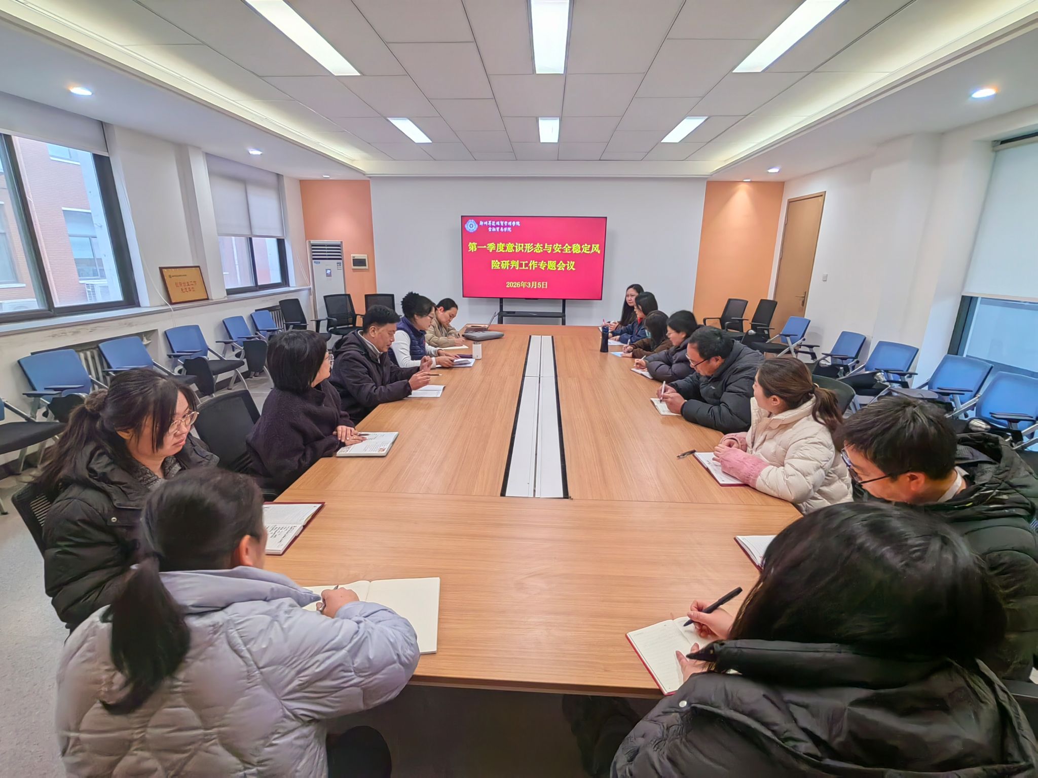 为压紧压实工作责任,精准排查化解风险隐患。3月5日,金融贸易学院在212会议室召开2026年第一季度意识形态与安全稳定风险研判工作专题会议。全体党委委员、各党支部书记参加,会议由党委书记张小雁主持。