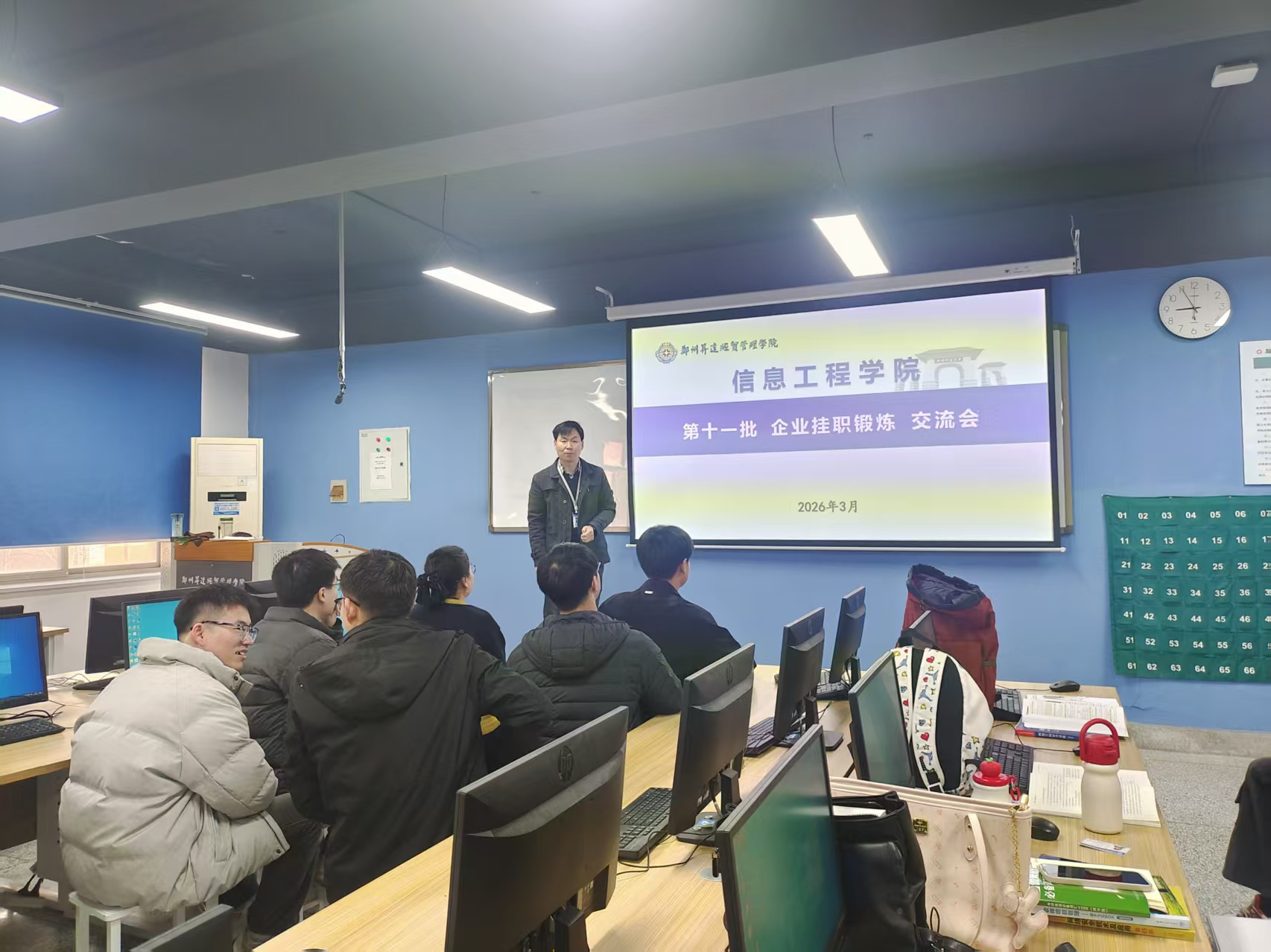 为进一步深化产教融合内涵,强化教师工程实践能力,推动校企合作成果向教学资源转化,信息工程学院于2025年3月9日下午在资讯楼215网络空间安全实验室举行第十一批教师挂职锻炼汇报交流会。本次会议以“总结实践成效、共享行业经验、赋能教学改革”为目标,信息工程学院各教研室骨干教师代表参会交流。