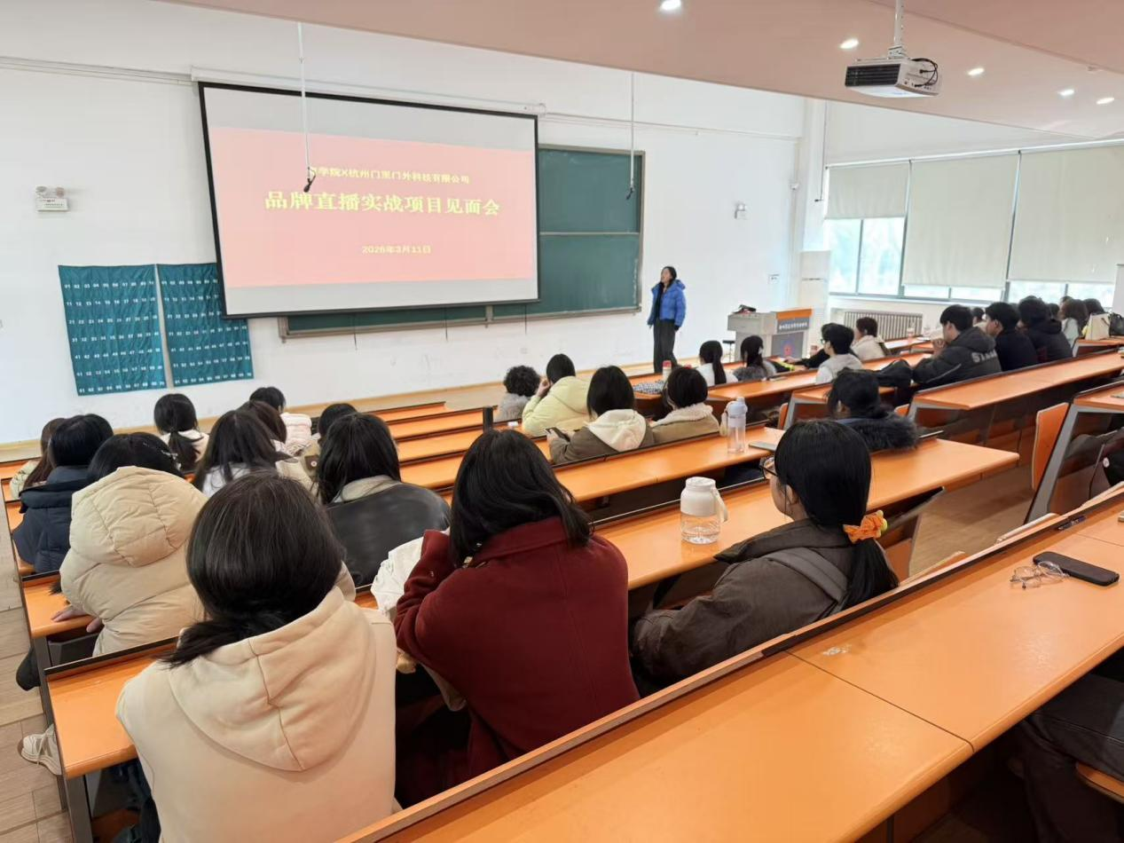 为落实校企合作共识,推动品牌直播项目落地,3月11日中午,商学院品牌直播实战项目见面会在教学楼2号楼116教室如期举行。本次见面会面向前期已报名及现场有意向加入的同学,旨在帮助大家全面了解项目详情并进行现场答疑。杭州门里门外科技有限公司直播项目负责人黄如男,两位驻校负责人刘红果与叶浩远,商学院产学研专员刘玲芳、产业学院教师刘广成、卢瑞娜共同出席见面会。