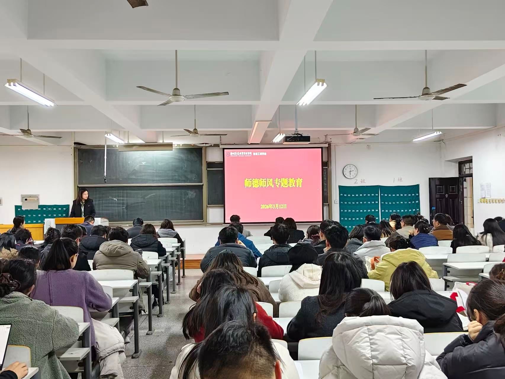 为持续深化新时代师德师风建设,全面落实立德树人根本任务,引导全体教职工以先进典型为标杆树立和践行正确政绩观,2026年3月12日下午,信息工程学院于资讯楼213教室召开师德师风专题教育会议。会议由学院党委书记钟江鸽主持,学院全体教职工参会。