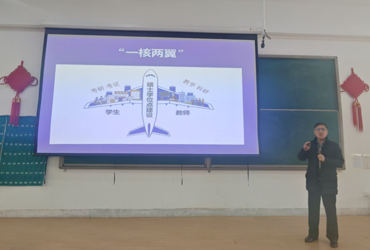 会上,王院长系统解读学院核心发展战略,明确“一核”为2026-2028年硕士学位点建设,这是学院发展的核心目标与重中之重;“两翼”分别立足学生与教师两大主体,学生端以考研、考证为核心抓手,夯实专业核心竞争力,教师端深耕教学科研,提升育人与科研能力,唯有两翼协同平衡发展,方能为硕士点建设保驾护航。