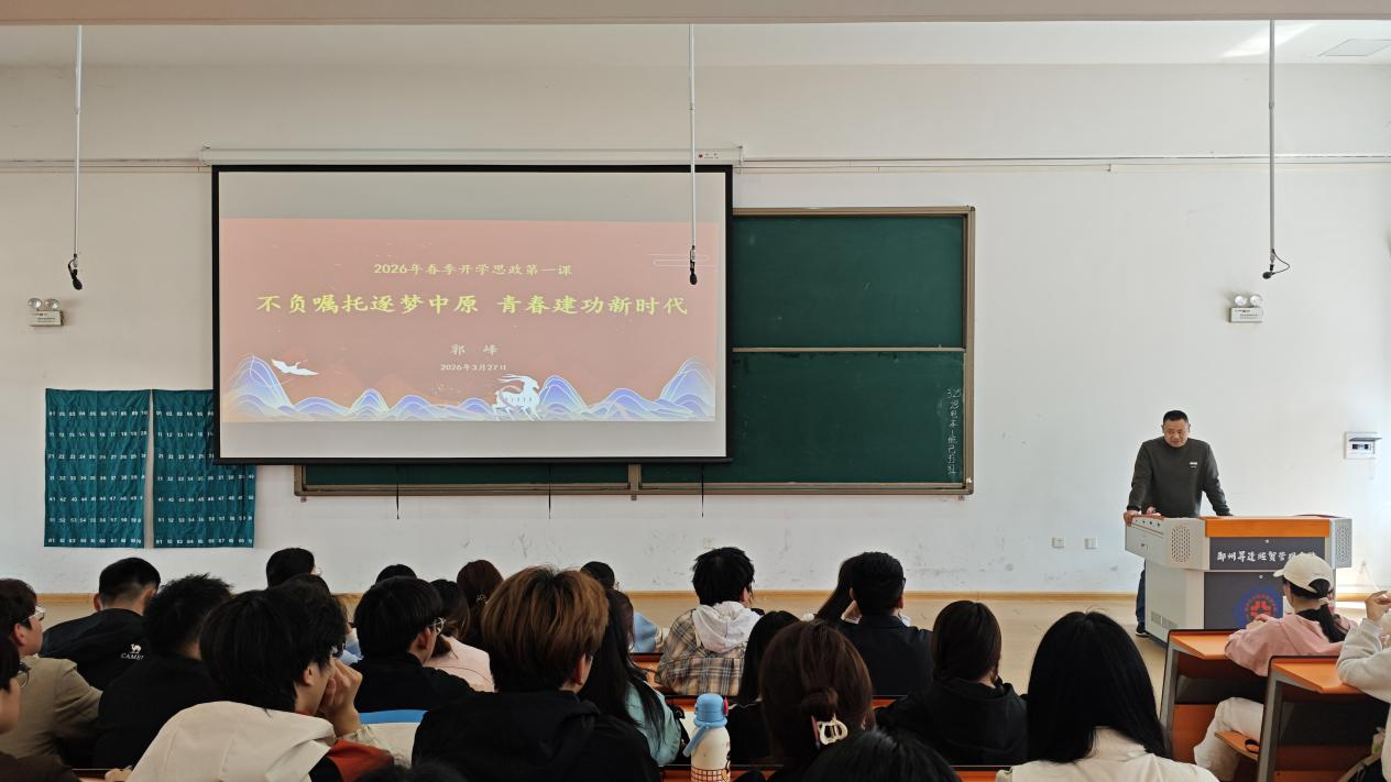 2026年3月27日下午,商学院党委书记郭峰在教学2号楼116教室,以“不负嘱托逐梦中原青春建功新时代”为主题,为各班级学生代表讲授春季开学思政第一课,深入学习习近平总书记在河南考察时的重要讲话精神,引导青年学子明晰新时代的责任与担当,凝聚奋进前行的青春力量。