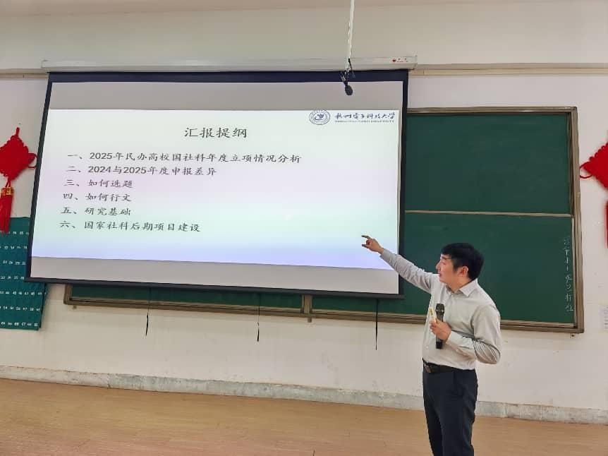 随后邱保印教授结合自身科研经验与行业前沿动态,展开系统讲解。邱教授首先解读了2025年民办高校国社科年度立项情况,结合数据与案例分析了当前民办高校国社科申报的整体态势与发展特点,让在场教师对民办高校国社科申报的整体格局有了更清晰、全面的认知。