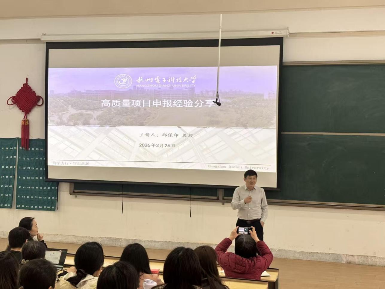2026年3月26日14:00,为进一步提升学院教师科研项目申报能力与学术水平,助力学科建设与申硕工作提质增效,在教学4号楼118室,会计学院全体教师参加了由我院杰出校友杭州电子科技大学会计学院邱保印教授主讲的“高质量项目申报经验分享”专题讲座。本次讲座由会计学院毕鹏翾副院长主持。