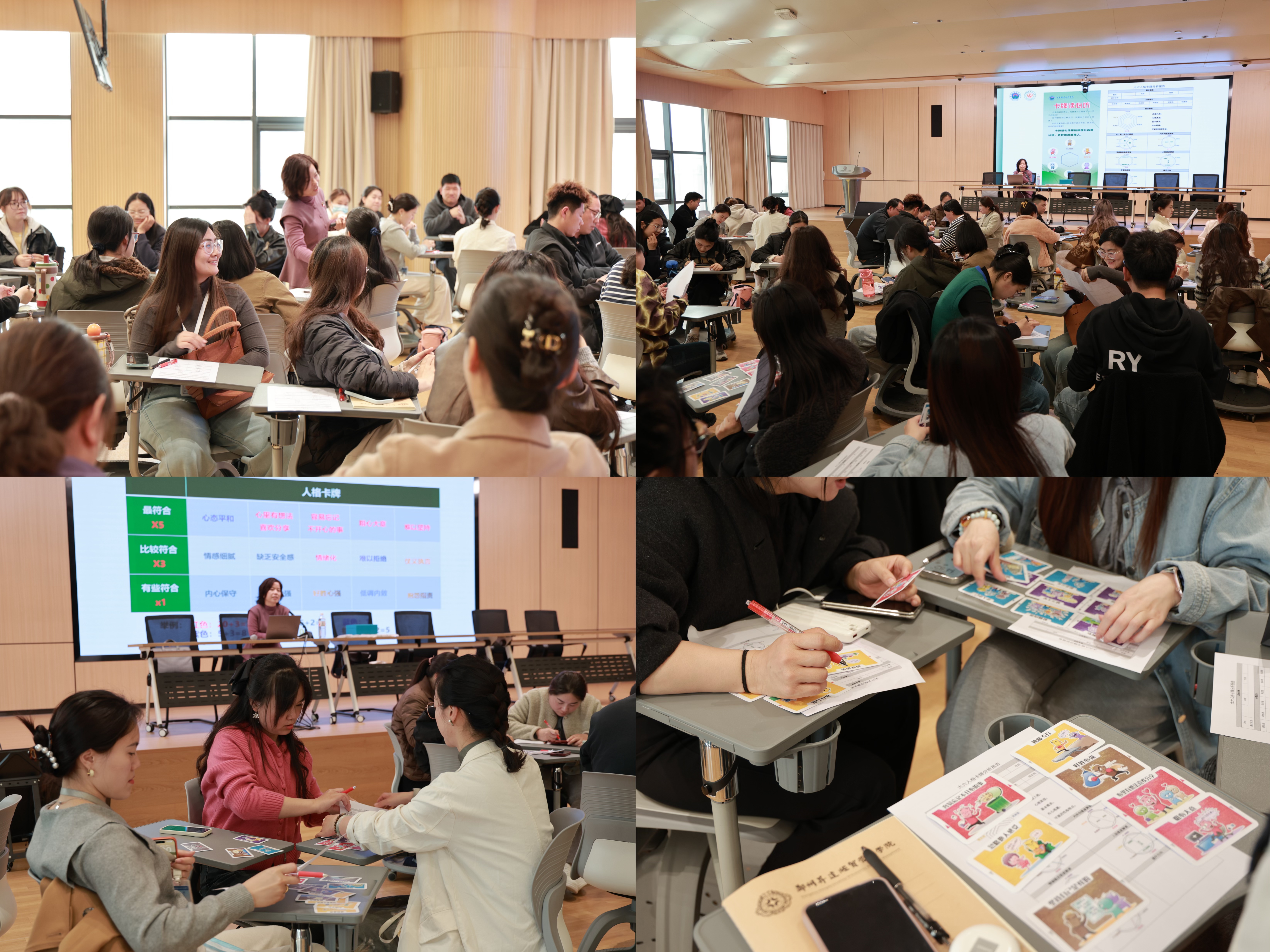 温教授系统介绍了大六人格理论,将人的核心人格划分为快乐我、敏感我、完美我、和谐我、现实我、权威我六种类型,并详细阐述了每种人格的特质、思维模式及行为表现。辅导员老师们通过抽取卡牌、对照特质解读,进行实操体验,组内分享,在互动交流中加深了对人格类型的理解,学习了如何引导学生通过卡牌表达内心、释放压力,掌握了符合学生心理需求的沟通策略。