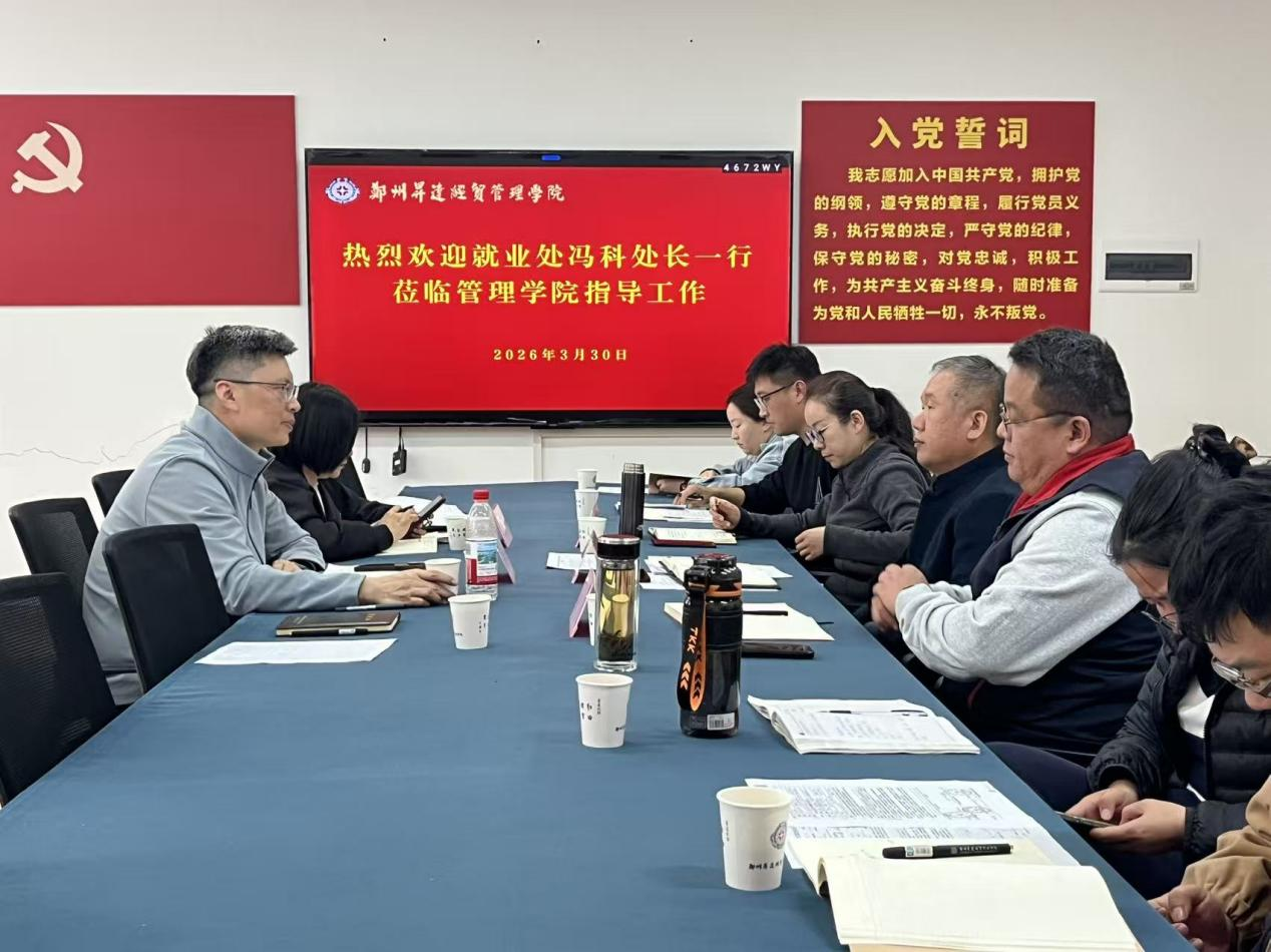 为进一步推进学院毕业生就业工作高质量开展,精准破解就业工作难点痛点,优化人才培养与就业服务衔接机制,3月30日,就业处处长冯科、就业与校友科科长鲁玲玉一行深入管理学院开展2026届毕业生就业工作专项调研指导。管理学院院长朱影影、党委书记职正路、副书记许广庆、就业专员范留涛及毕业班辅导员参会。