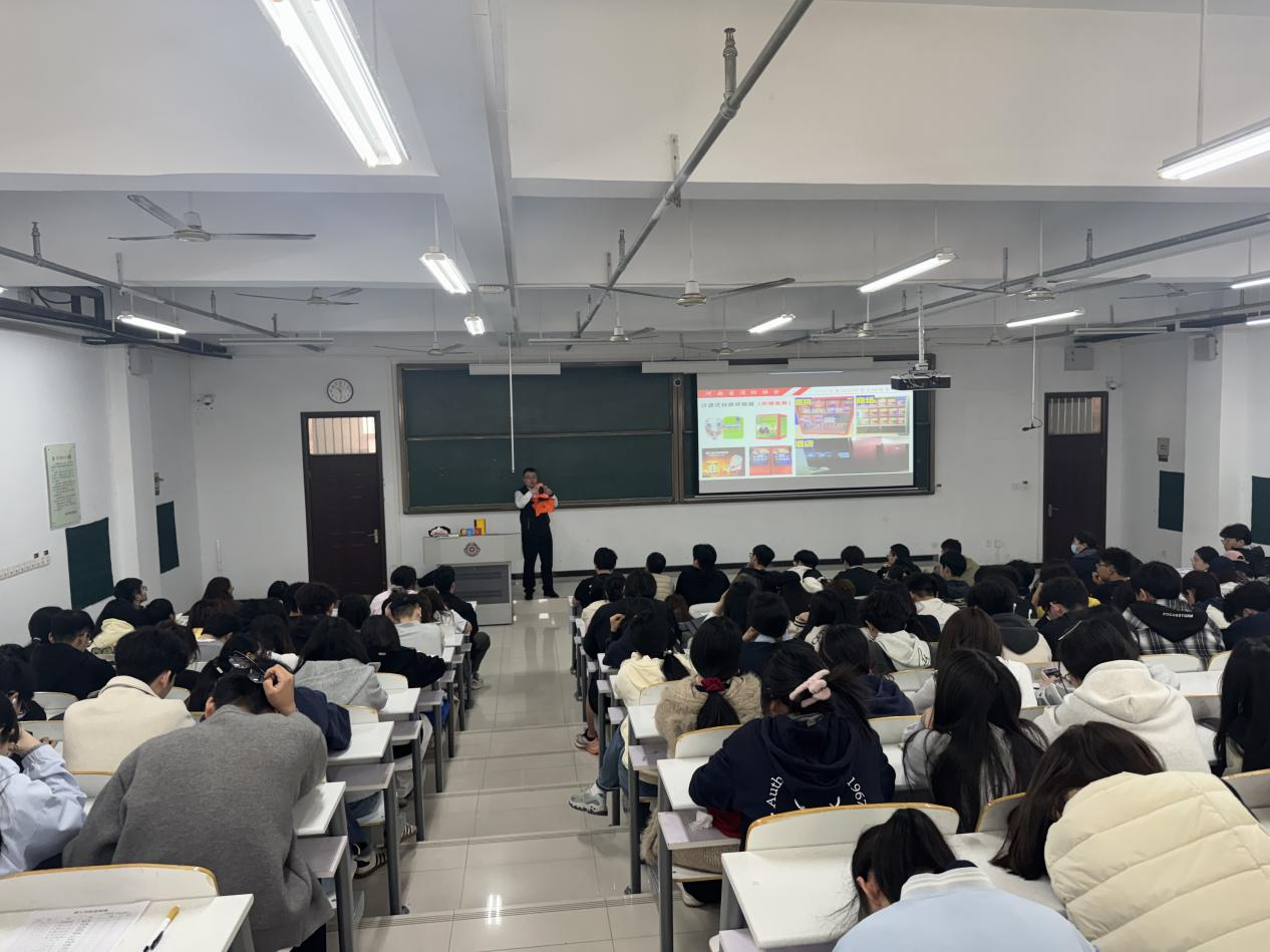 李指导员结合近年来高校及校园周边发生的典型火灾案例,以视频、图片和数据等直观形式,深入剖析了学校火灾的主要特点与危害。他指出,校园人员密集、用电负荷大、易燃物品多,一旦发生火灾,蔓延速度快、疏散难度大,后果不堪设想。因此,每一位在校学生都应时刻绷紧消防安全这根弦,做到防患于未然。围绕学生日常学习生活的主要场所,李指导员逐一讲解了宿舍、教室、实验室及校园公共场所的火灾风险点与防范要点。在宿舍区域,他重点强调了违规使用大功率电器、私拉乱接电线、长时间给手机及充电宝充电等行为的巨大隐患,并通过真实案例视频展示了因电器过热短路引发宿舍火灾的惨痛后果。他还特别提醒同学们,宿舍内吸烟、乱扔烟头极易引燃被褥、纸张等可燃物,要坚决杜绝。