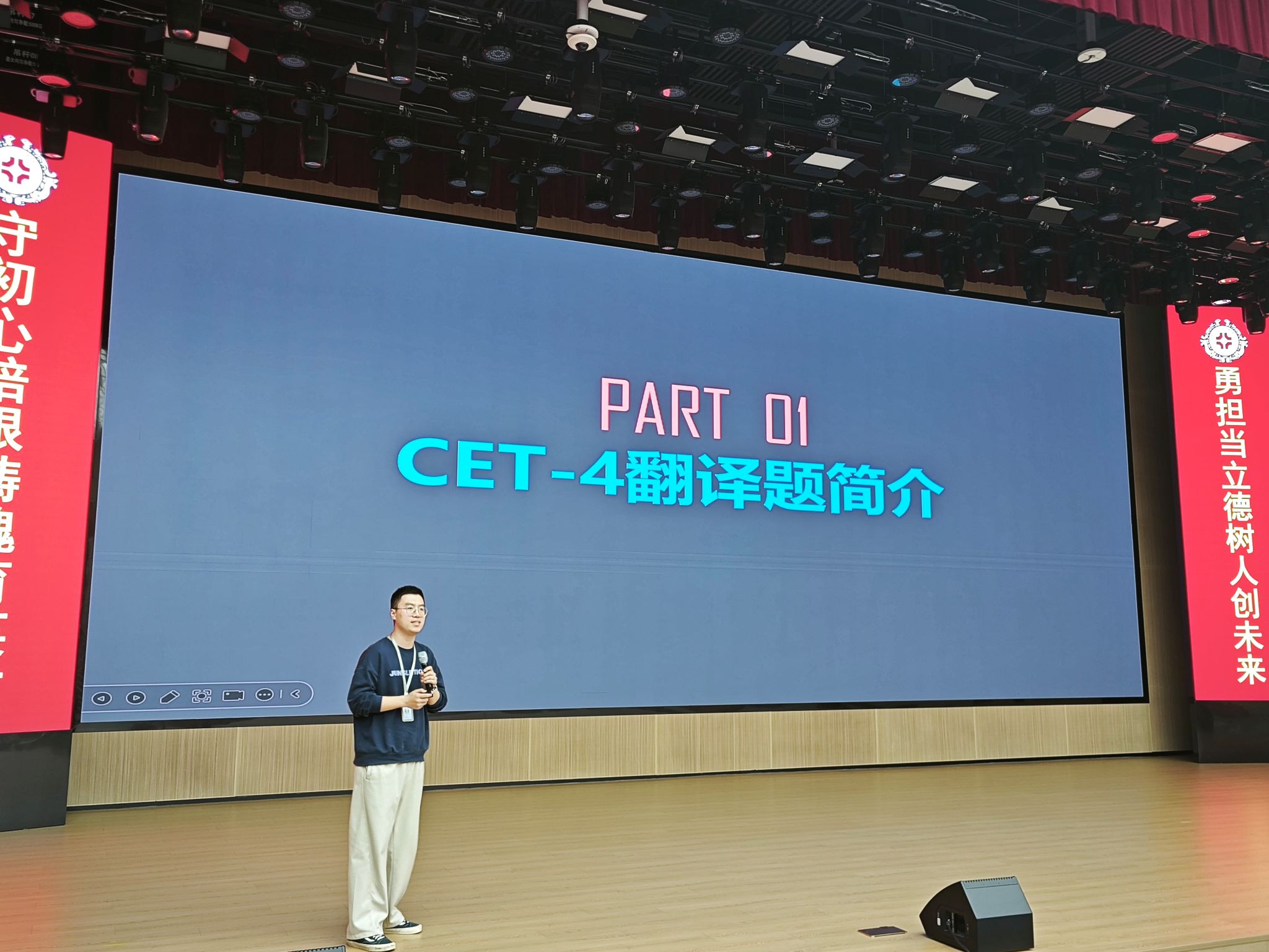 活动中,张逸洋老师围绕四级翻译备考进行系统讲解,介绍了四级翻译考查形式、评分标准,分析汉英语言差异及常见问题,并提出“理解—拆分—翻译—检查”四步法。随后结合“四合院”,“city walk”真题开展现场演练,带领师生逐句分析、实战翻译,针对性突破长难句处理难点。