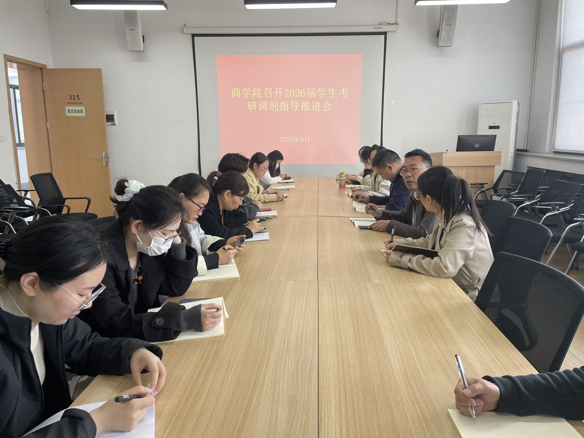 为深入推进毕业生升学指导工作,精准服务考研学子成功上岸。4月9日上午,商学院在教学2号楼315会议室召开2026届学生考研调剂指导推进会。商学院院长白朋飞、党委书记郭峰、教学秘书马巧丽、党委副书记郗艳花、2026届本科辅导员及各教研室主任参加了此次会议,会议由白院长主持。