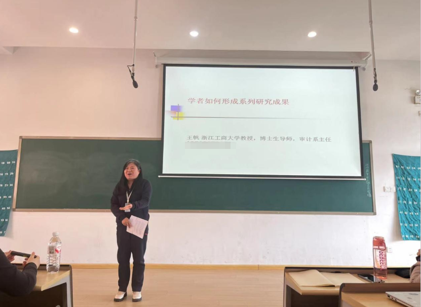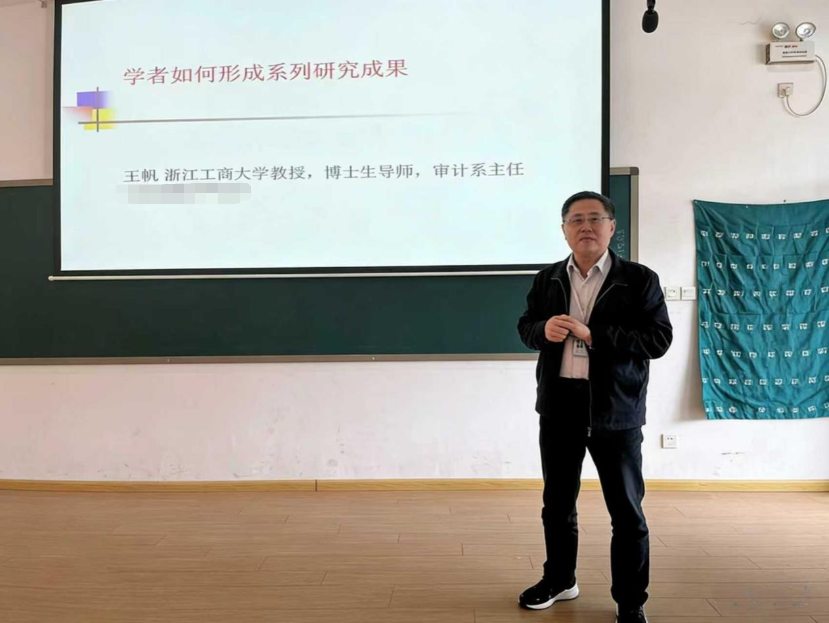 为进一步提升会计学院教师科研能力,助力学科建设与申硕工作提质增效。会计学院特邀浙江工商大学审计系主任、博士生导师王帆教授于4月9日14时,在教学4号楼208室举办《学者如何形成系列研究成果》学术讲座。会计学院院长王宝庆出席会议,本次会议由副院长毕鹏翾主持,会计学院全体教师参加学习。