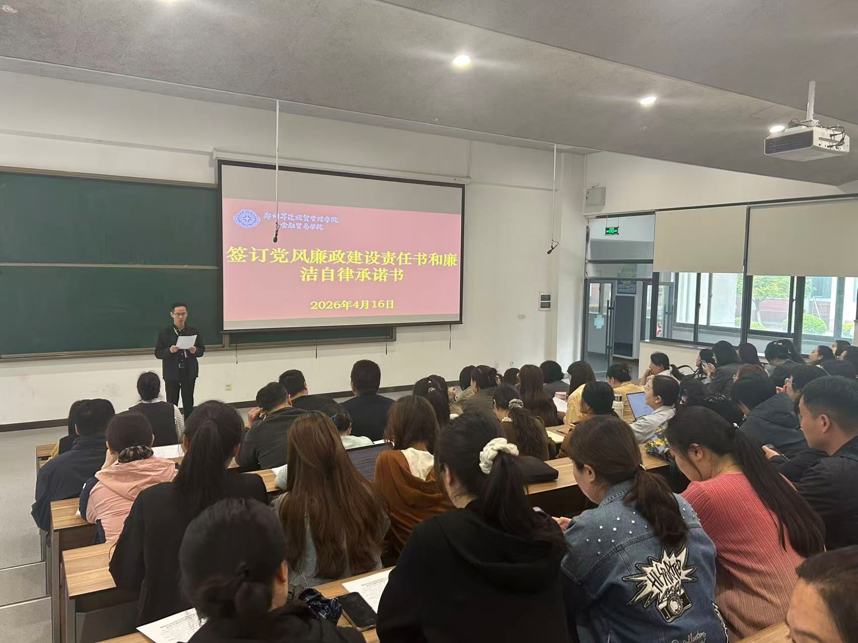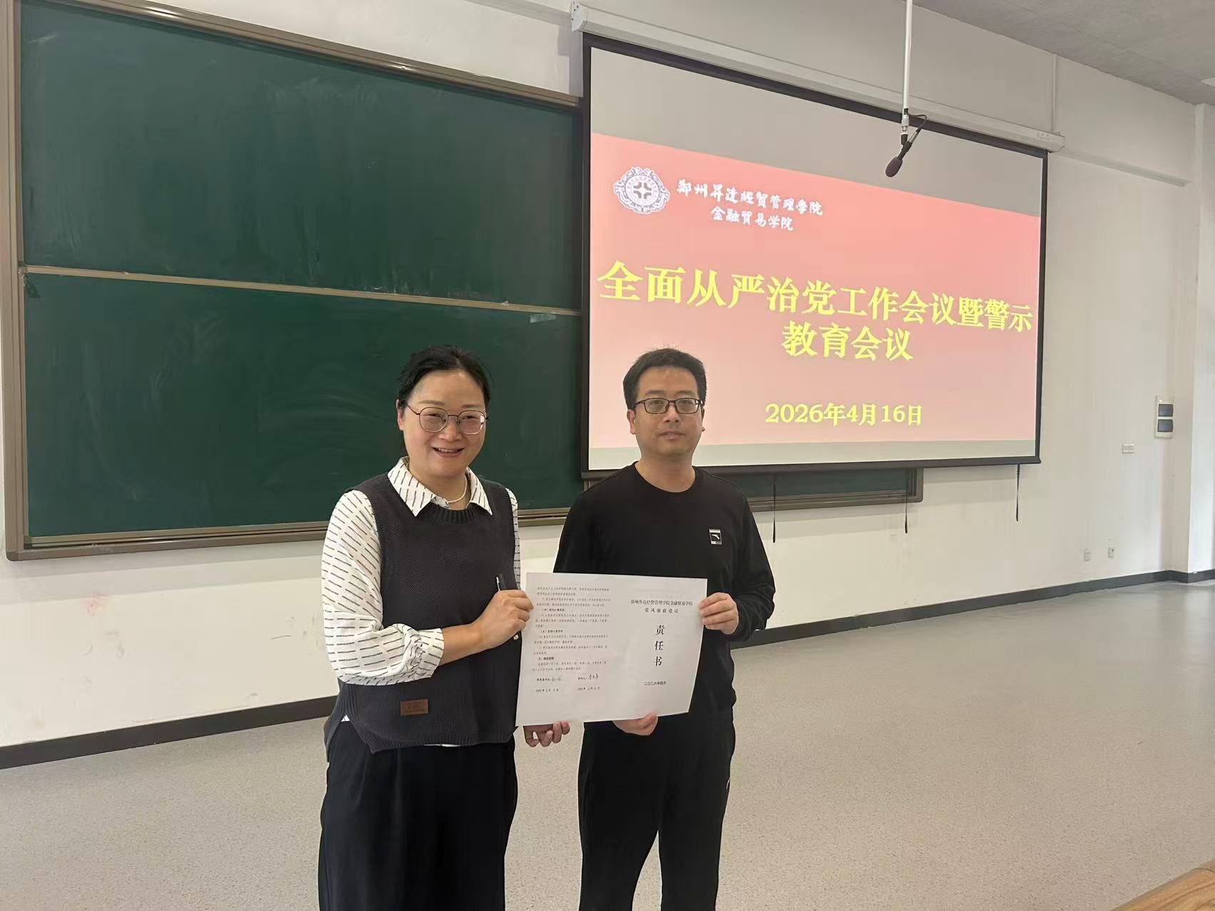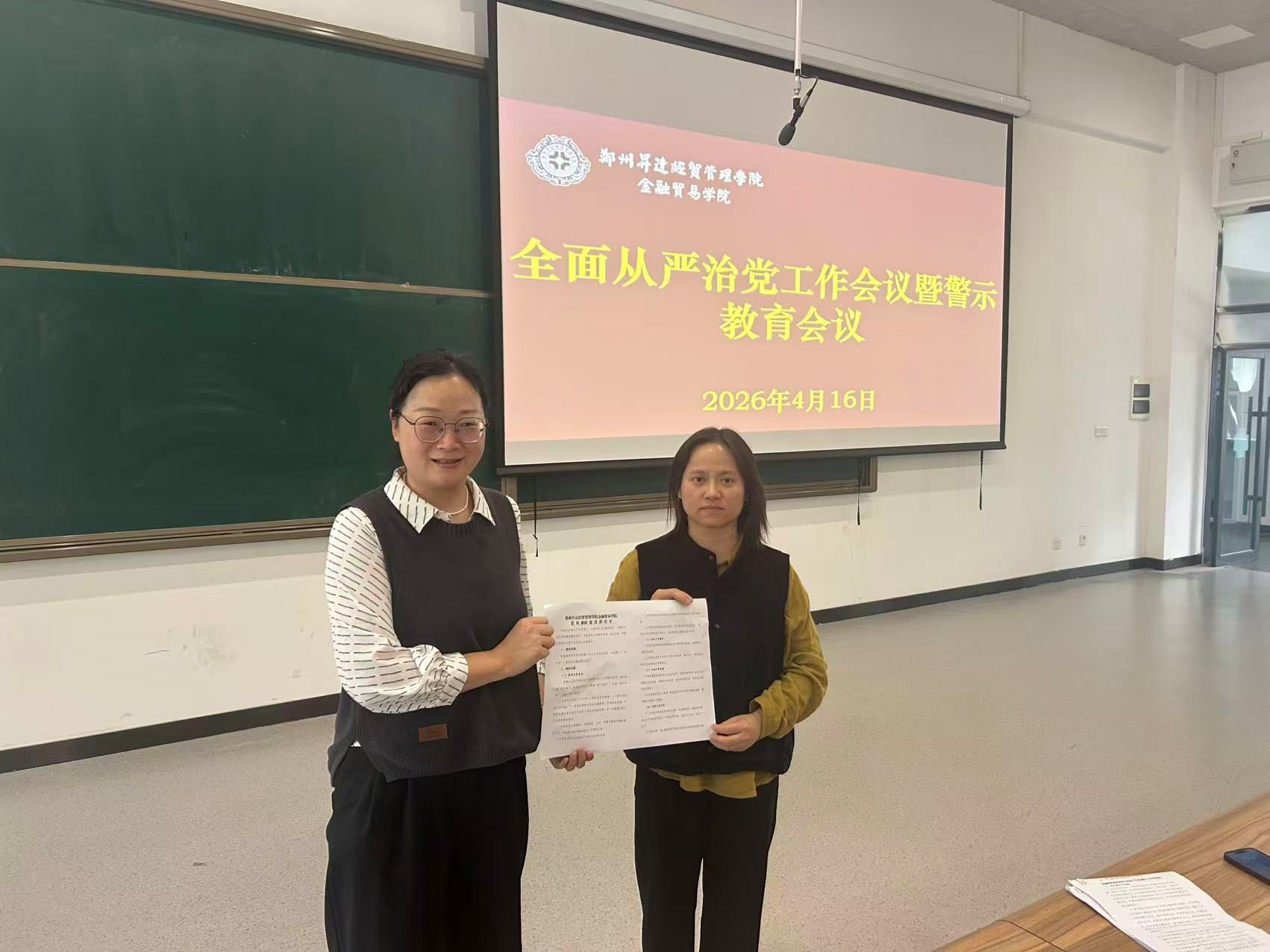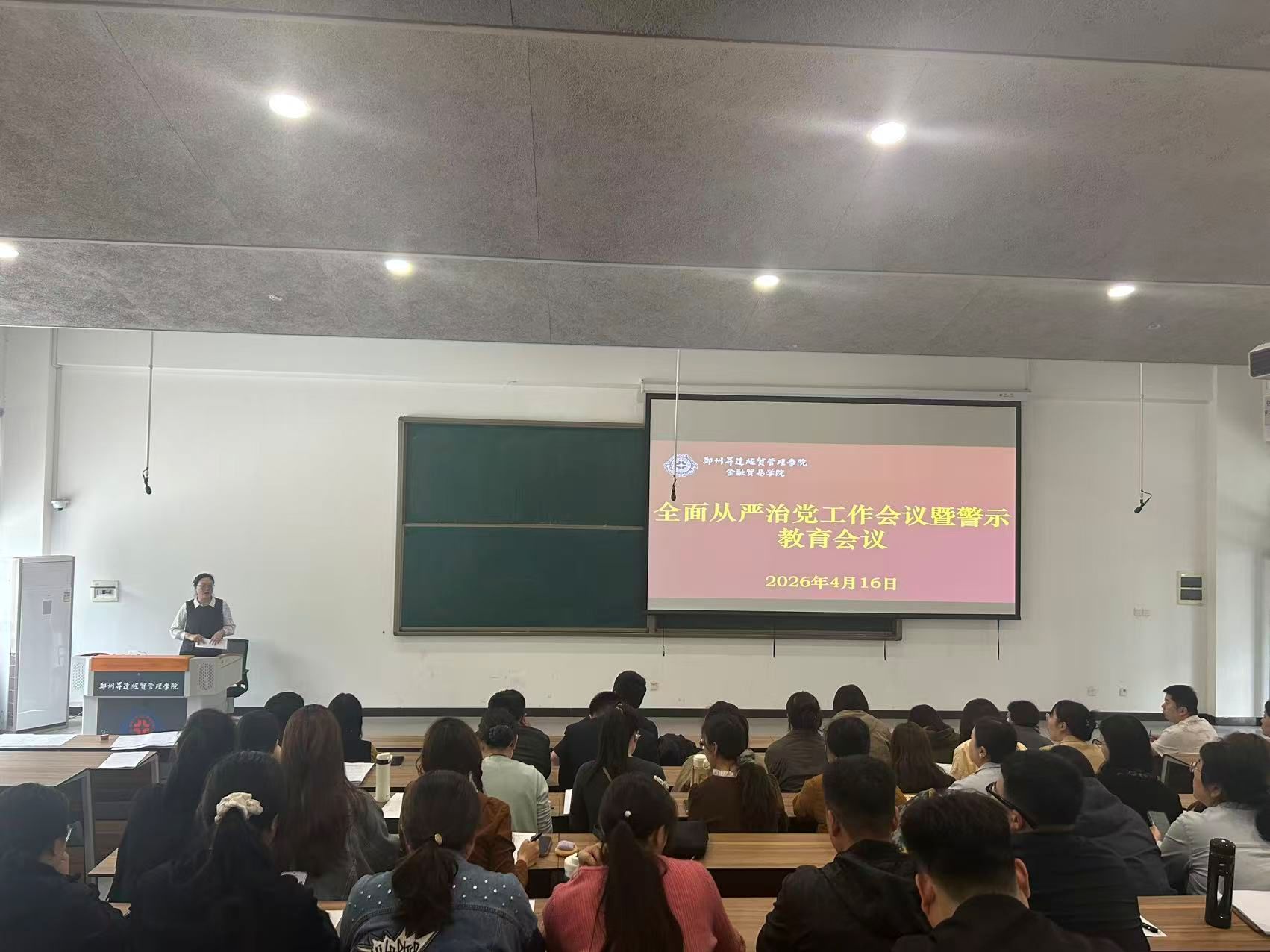 为深入贯彻落实全面从严治党要求,强化党风廉政建设,筑牢教职工廉洁自律思想防线。4月16日,金融贸易学院在3-107教室召开2026年全面从严治党工作会议暨警示教育会议。学院全体教职工参会,会议由学院党委书记张小雁主持。