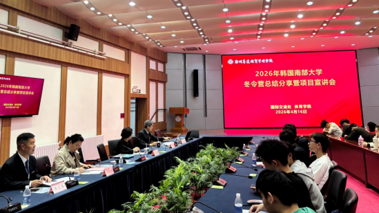 4月16日下午,2026年韩国南部大学冬令营总结分享暨国际交流项目宣讲会在国际会议厅圆满举行。韩国南部大学对外合作处处长具珉、语言学院院长金恩福,学校国际交流处处长顿雁峰、体育学院党委书记韩炎涛、体育学院教学秘书王培培等出席活动,体育学院师生及冬令营营员代表共同参与。会议由体育学院党委书记韩炎涛主持。