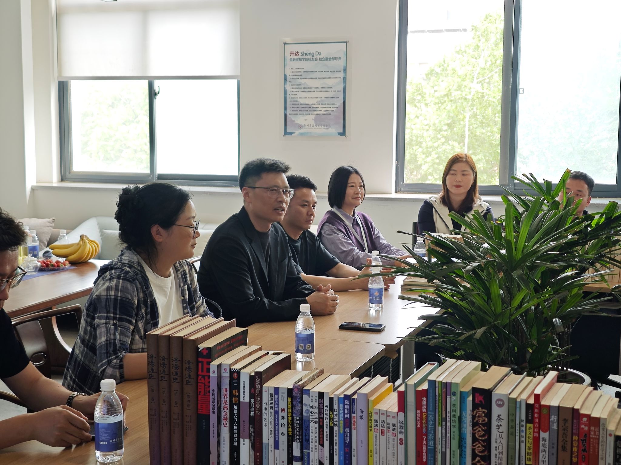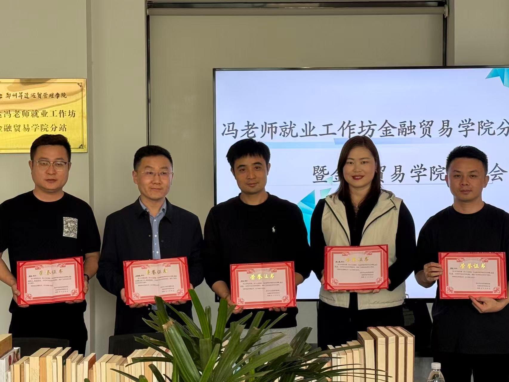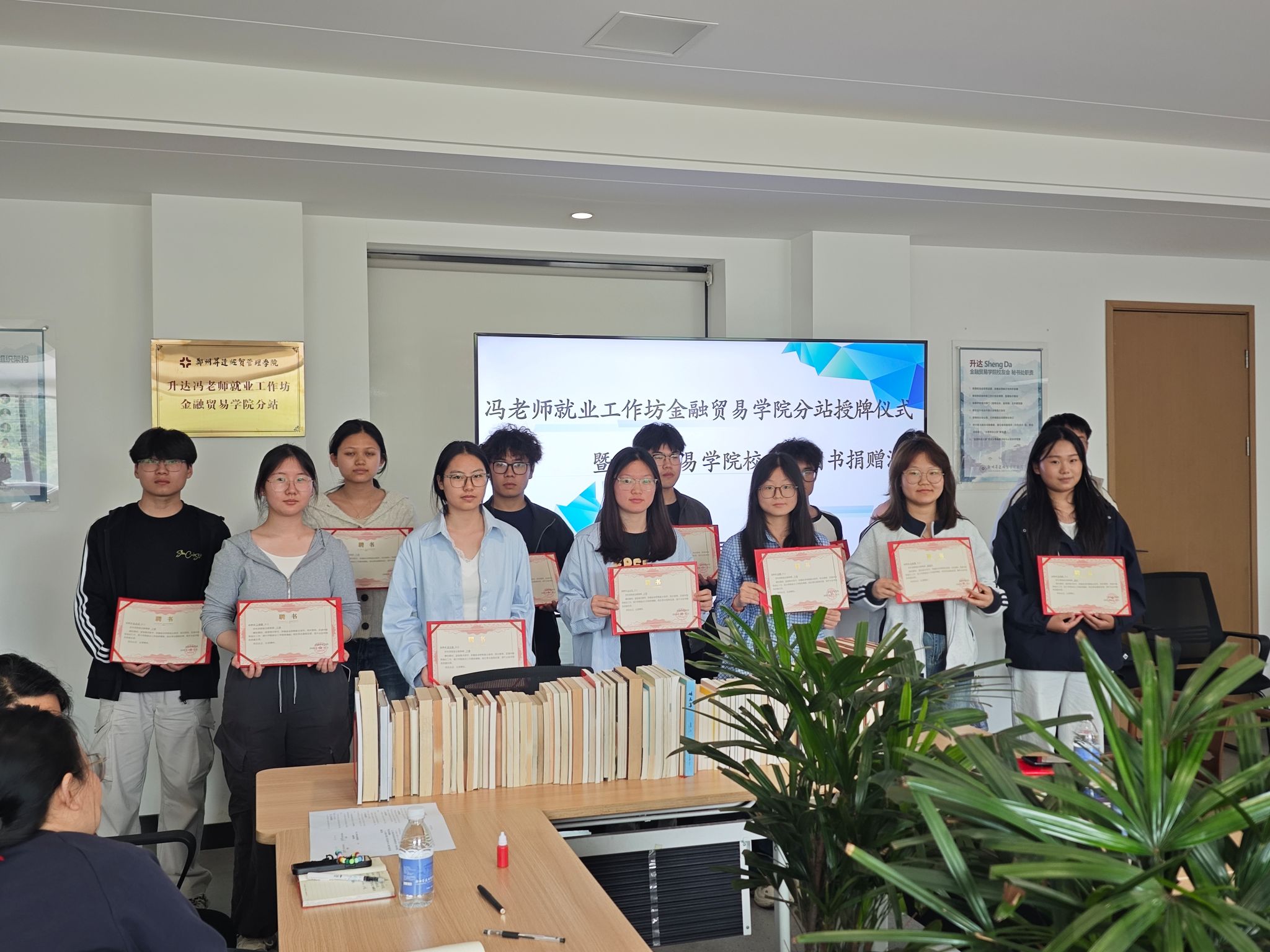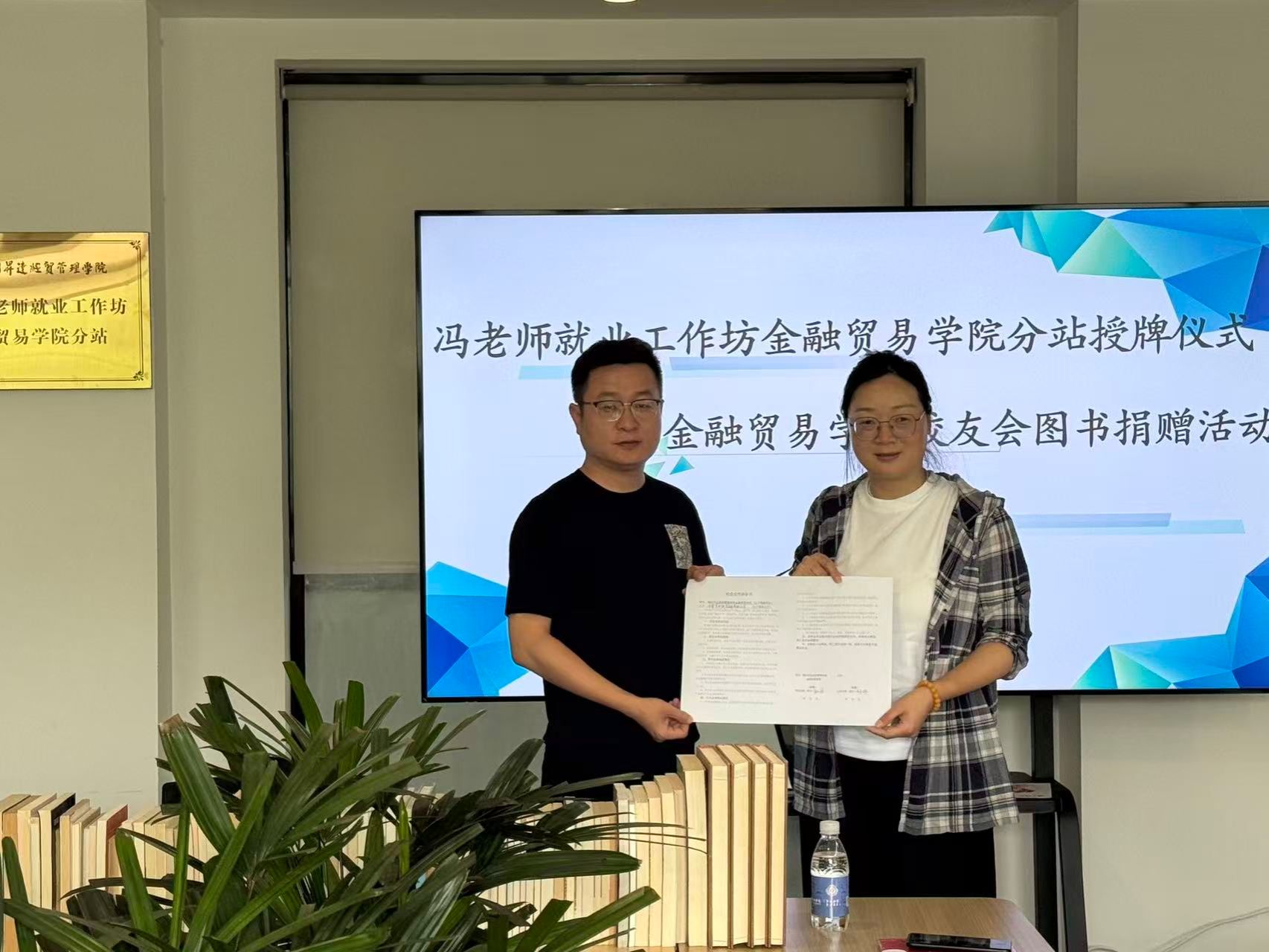 2026年4月15日下午,冯老师工作坊金融贸易学院分站授牌仪式暨校友会捐书仪式在3号楼206顺利举办。校就业处处长冯科、科长鲁玲玉、金贸学院党委书记张小雁、金贸学院校友会会长姚俊、副会长杨林、秘书长陈小薇等校友代表、2026届毕业班辅导员及校友联络部全体学生参加了此次活动。