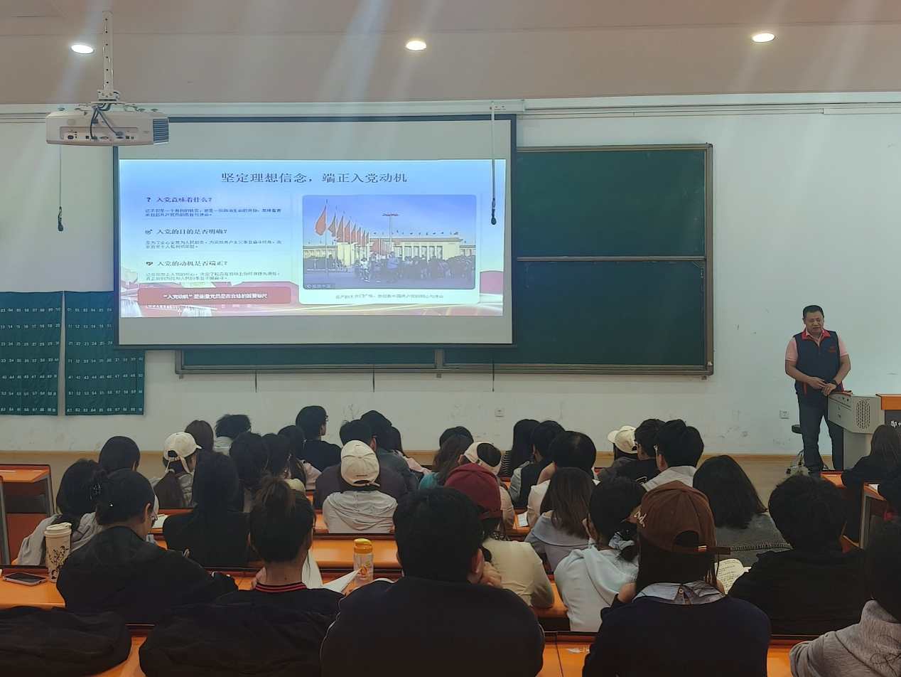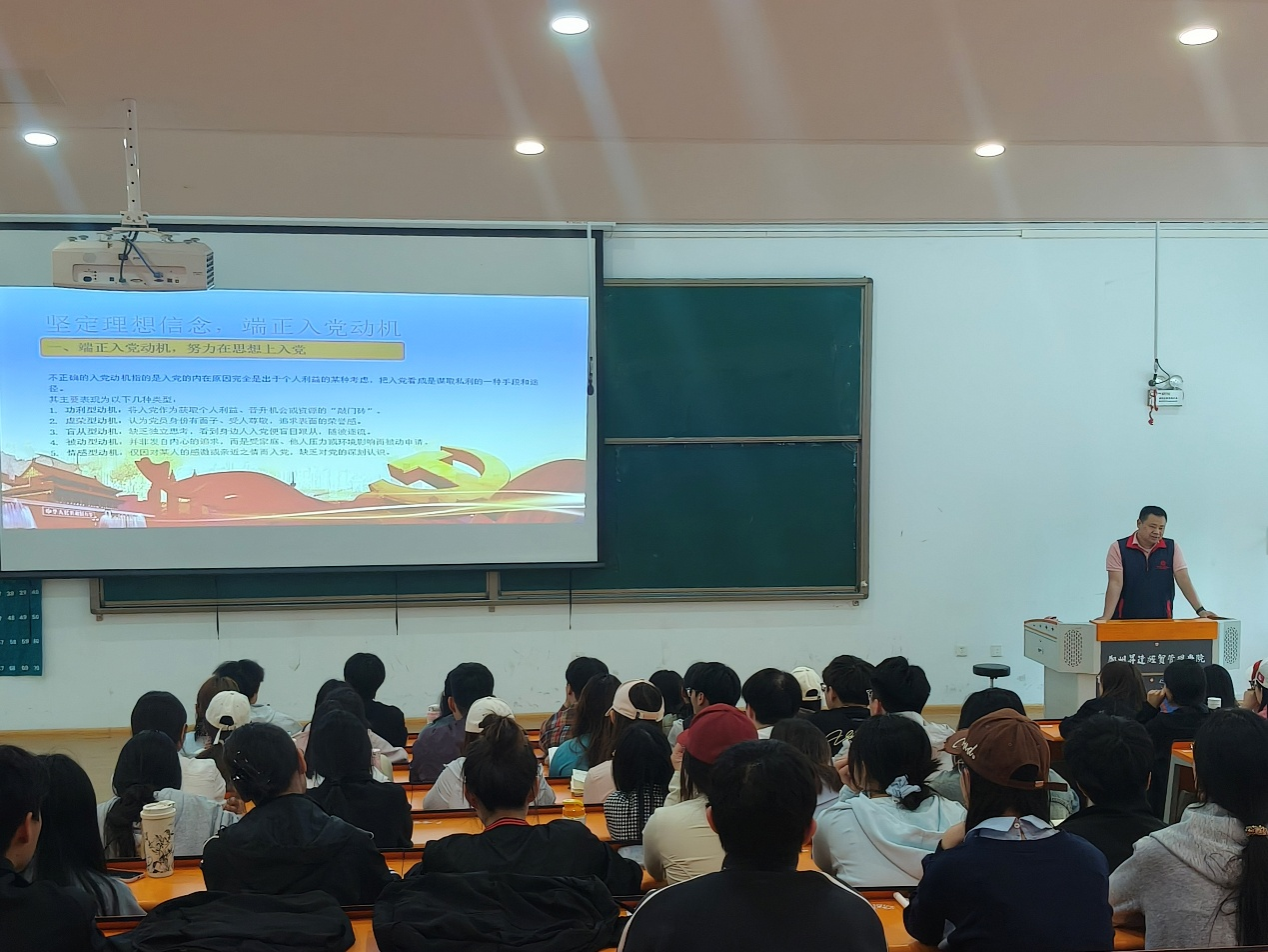 2026年4月16日,商学院党委书记郭峰以《坚定理想信念 端正入党动机》为主题在教学2号楼116教室为第23期党课学员讲授党课第一讲。