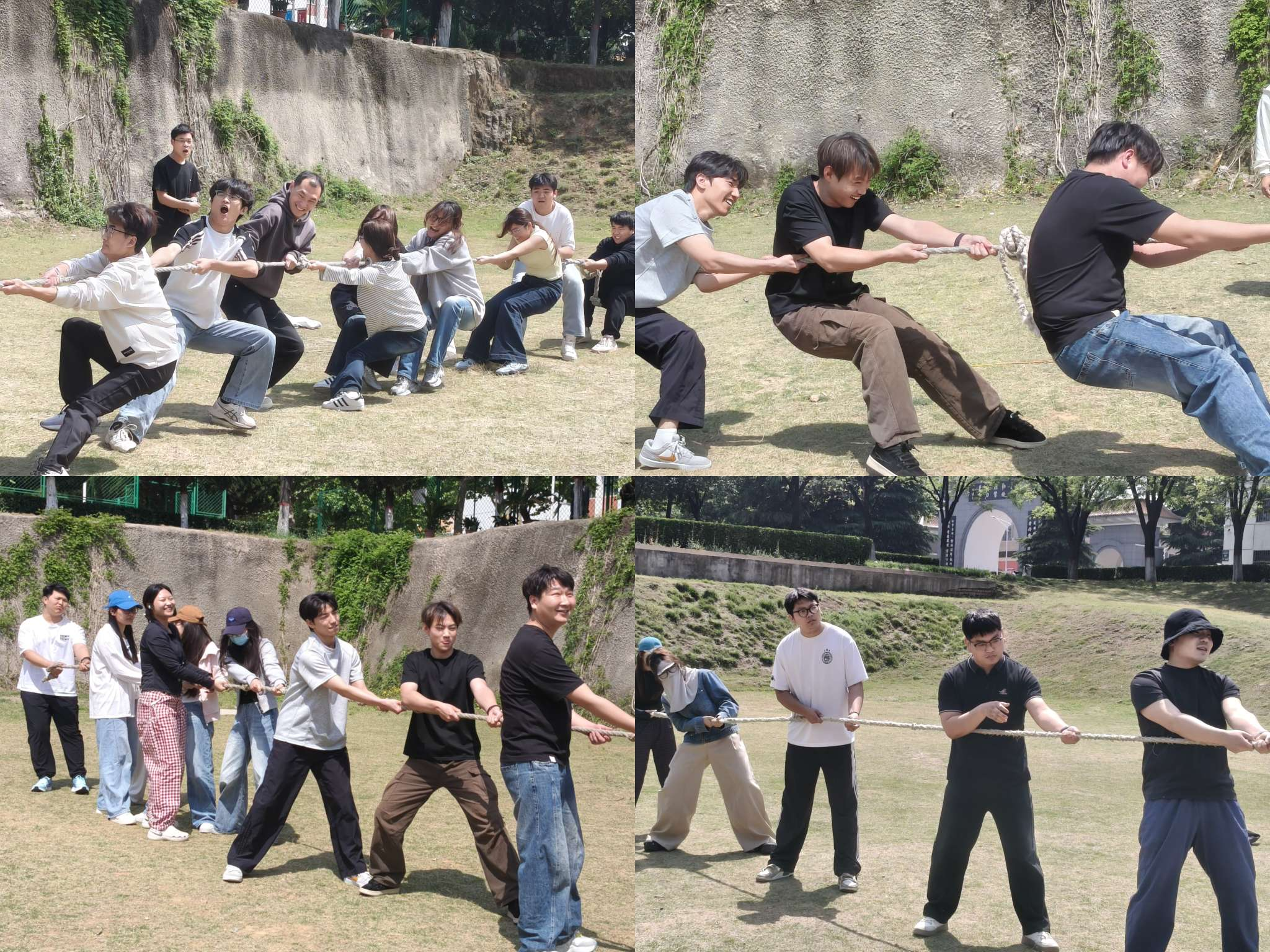 下午一点二十分,各参赛队伍准时集合完毕,现场进行了抽签分组。抽签结束后,随着裁判一声哨响,比赛正式拉开帷幕。只见队员们双手紧攥粗糙的麻绳,双脚像钉子一样狠狠踩进草地,身体齐刷刷向后倾倒。哨声刚落,双方就开始了激烈拉锯——绳子中间的红色标记忽左忽右,每一寸移动都牵动着全场的心。队员们个个咬紧牙关、面红耳赤,有的大喊口号给自己鼓劲,有的青筋暴起却仍死死拽住绳子不肯松手。场边观众的加油声一浪高过一浪,“一二!一二!”的呐喊声震耳欲聋。每赢下一局,获胜队伍的队员们便欢呼着摔倒在草地上,随即又笑着爬起来互相击掌、拥抱;输掉比赛的一方也不气馁,一边喘着粗气一边笑着调侃“手都要磨出泡了”。比赛现场成了一片沸腾的海洋,欢呼声、笑声、鼓掌声久久回荡在校园上空。
