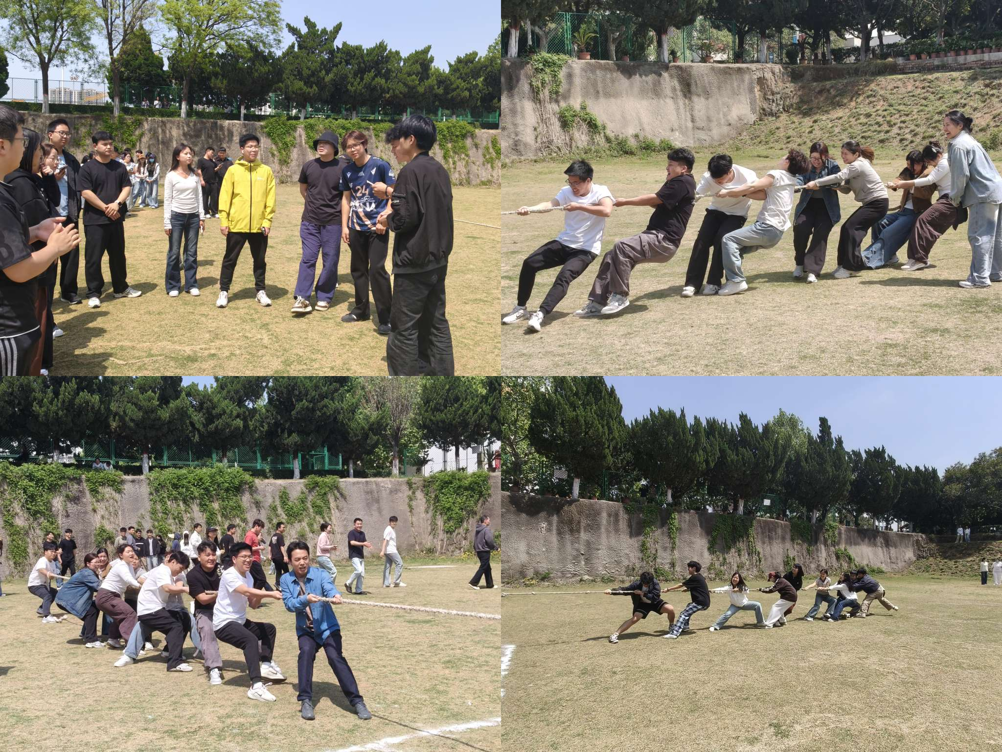 为增强学生体育锻炼意识,提升班级凝聚力与团队协作能力,根据学院“跃动青春·绳彩飞扬”体育文化节要求,4月23日下午,商学院在体育馆东侧草地举办了“凝心聚力,力拔山河”主题拔河比赛。