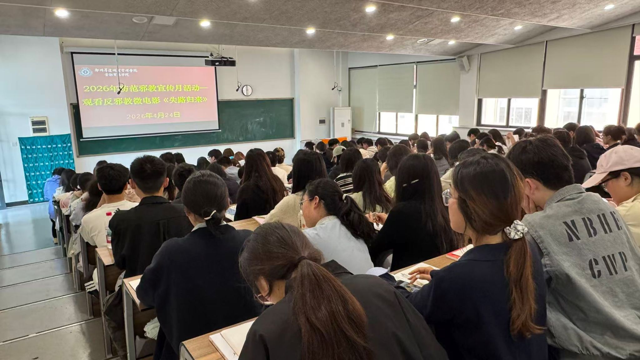 为深入贯彻总体国家安全观,进一步增强学生反邪教意识和国家安全意识,筑牢校园反邪教思想防线,4月24日,金融贸易学院反邪教协会在210教室组织学生开展防范邪教宣传月系列活动,集中观看警示教育片《失路归来》。