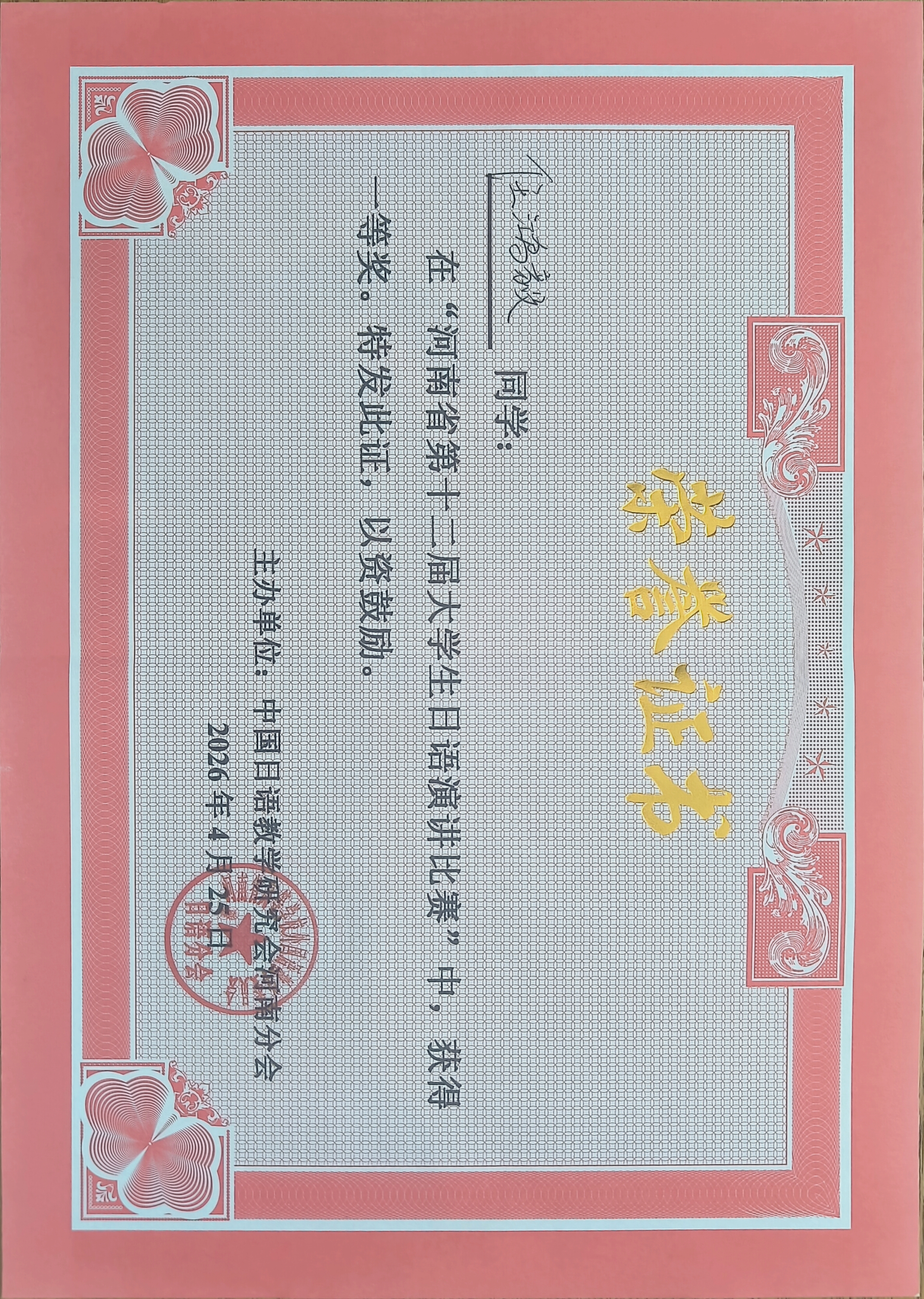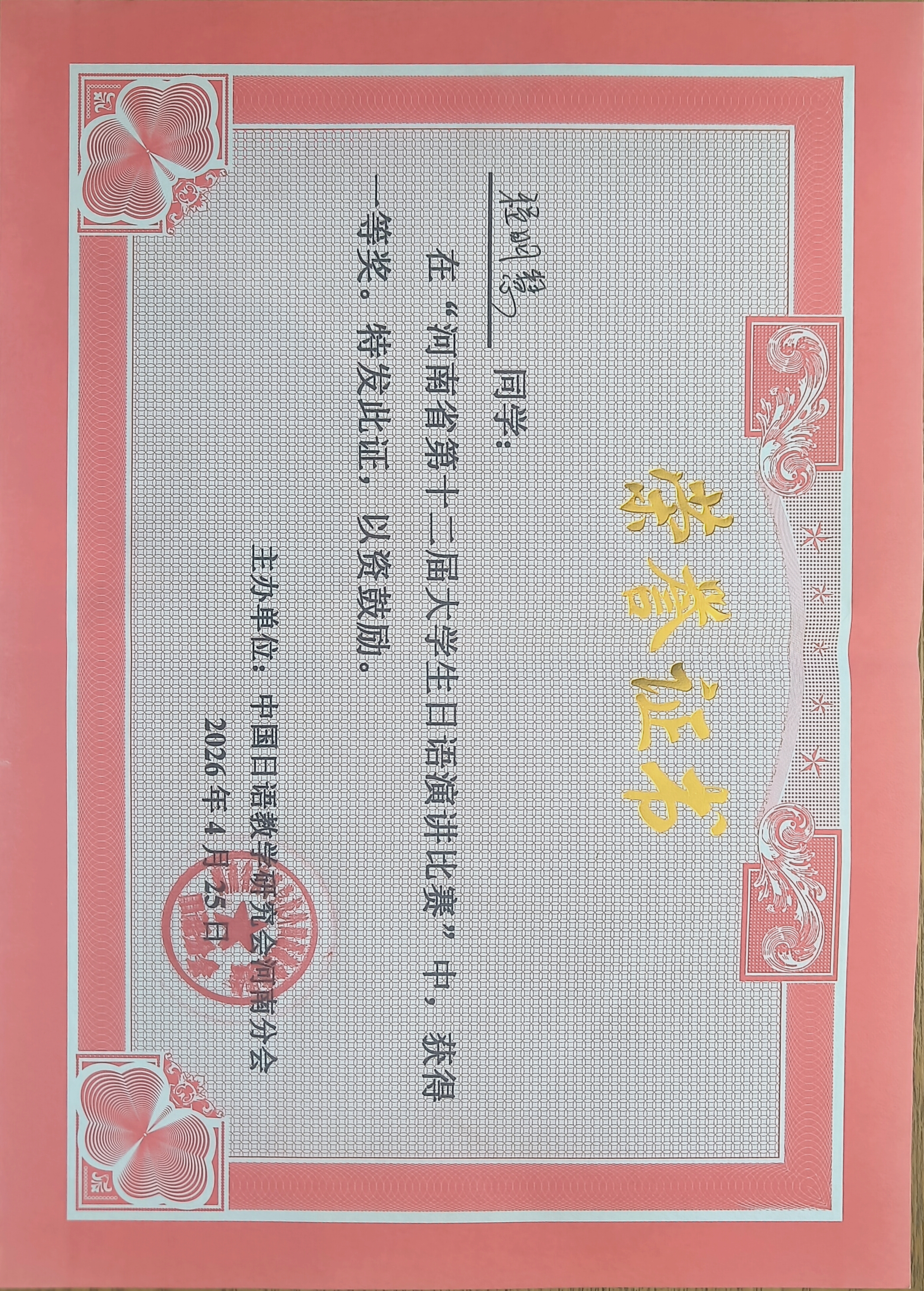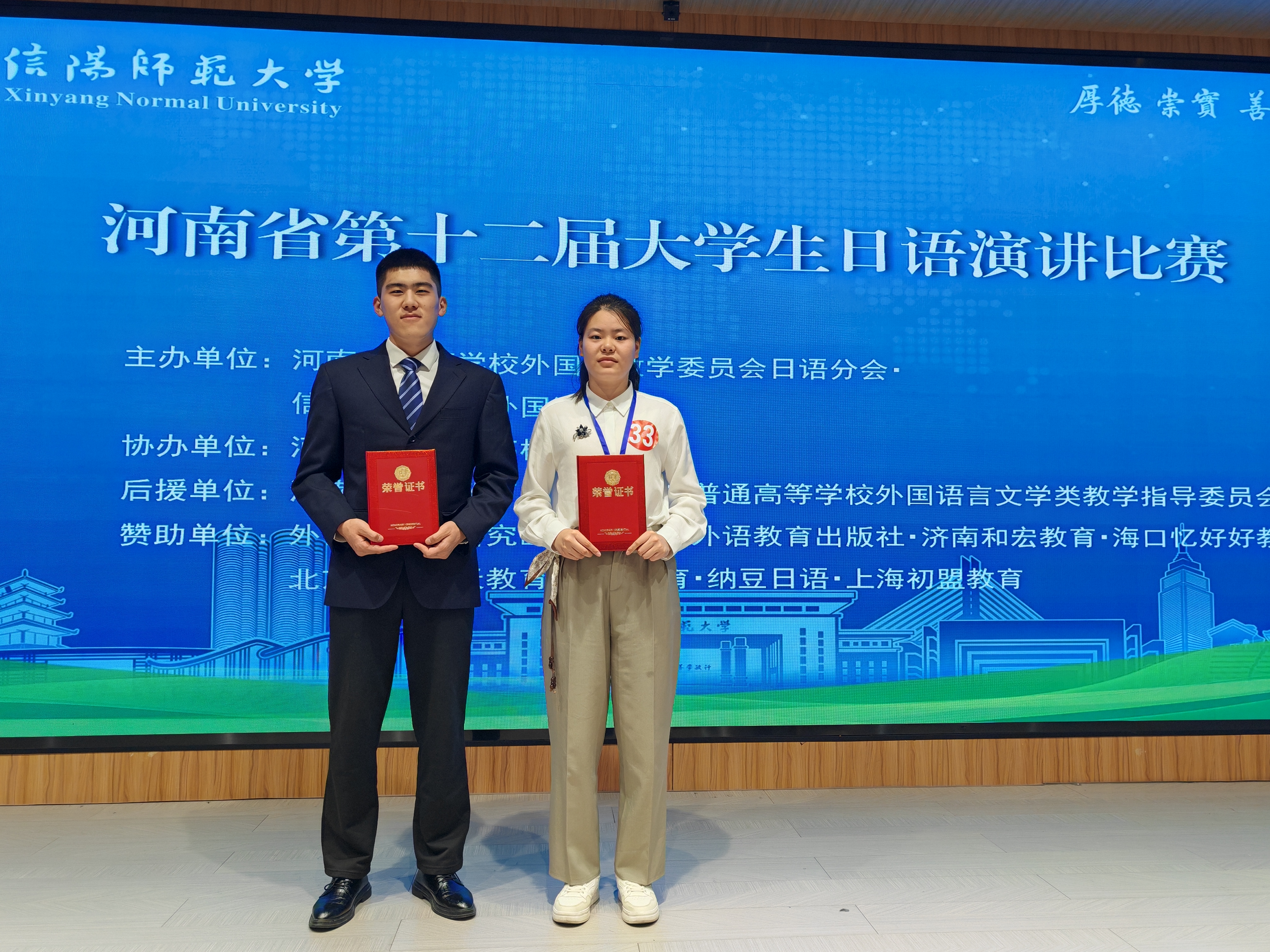 2026年4月25日,由中国日语教学研究会河南分会、河南省高等学校外国语教学委员会日语分会联合主办,信阳师范大学承办的河南省第十二届大学生日语演讲比赛成功举办。我校外国语学院日语专业两名学子沉着应战、表现亮眼,在全省高校众多选手中脱颖而出,斩获一等奖。