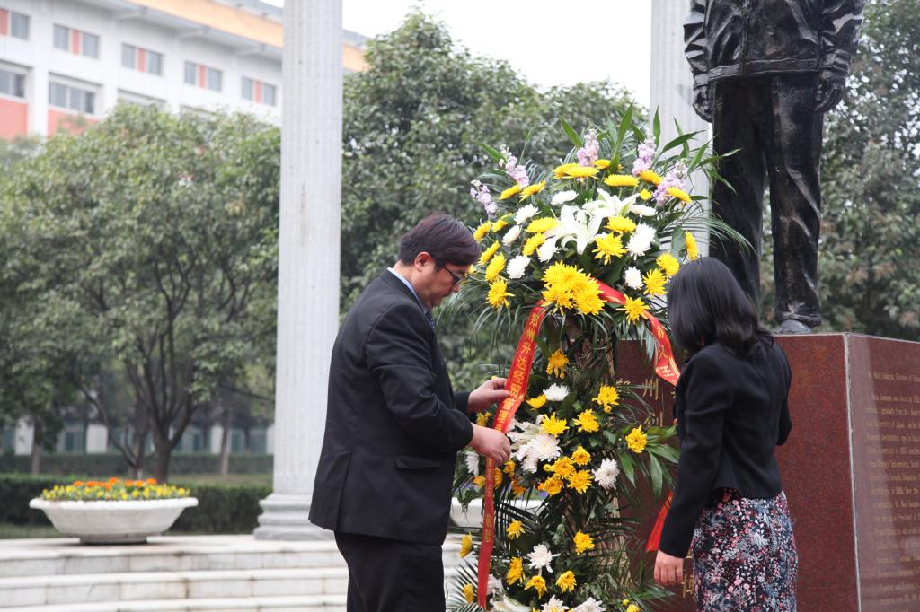 郑州大学西亚斯国际学院李华峰副书记一行向创办人敬献鲜花。