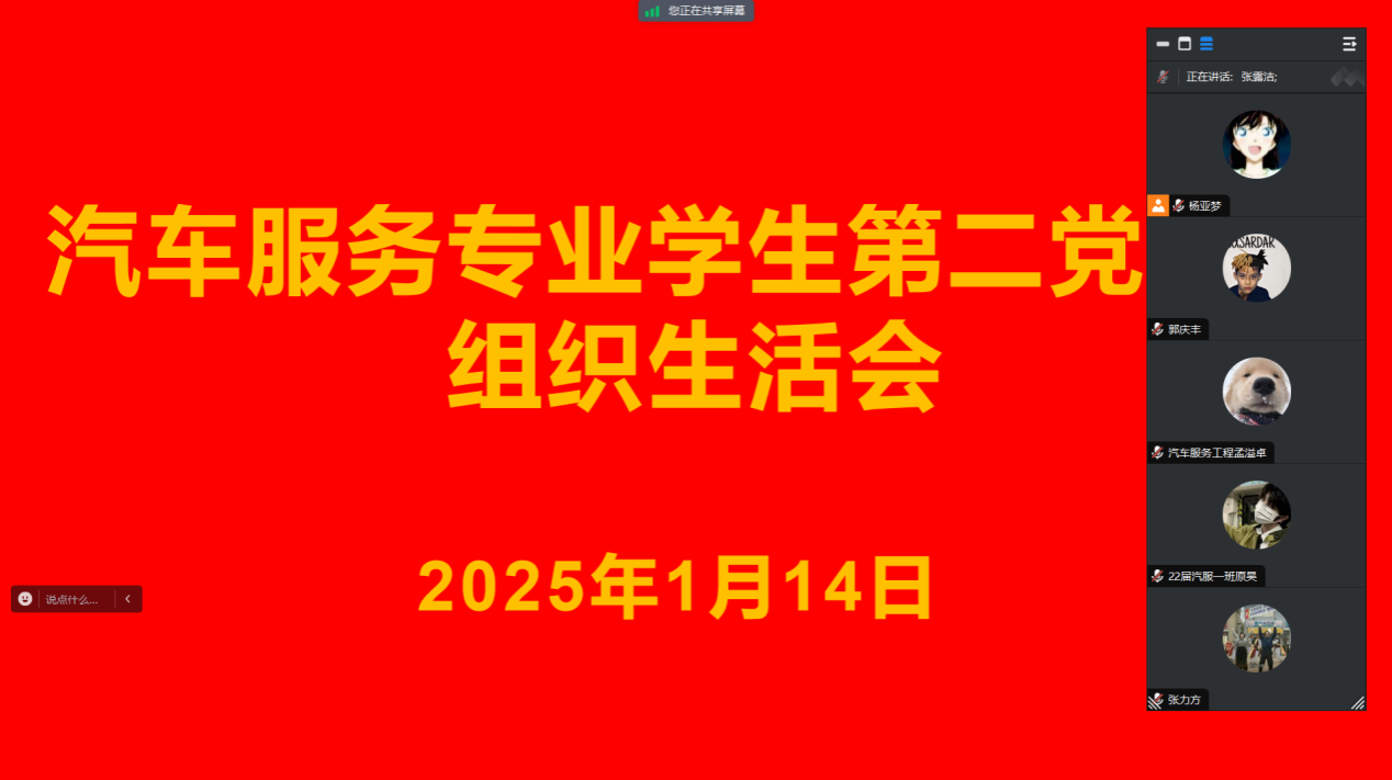 为深入学习贯彻党的二十届三中全会精神和全国教育大会精神,巩固深化党纪学习教育成果,提高机电学院汽车服务专业学生第二党支部全体党员的党性觉悟和业务水平,2025年1月14日上午,机电学院汽车服务专业学生第二党支部召开线上组织生活会,支部书记杨亚梦及支部全体党员参加会议。
