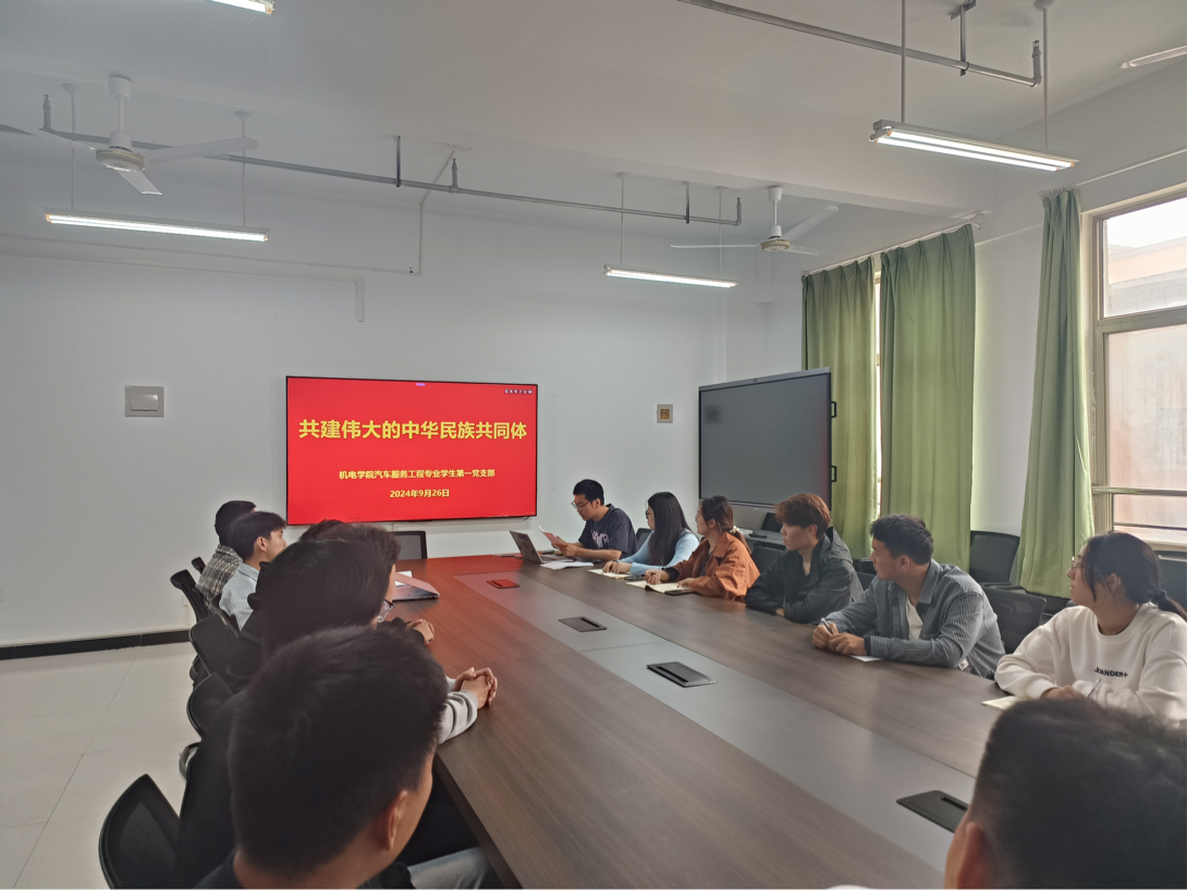 为凝聚奋进力量,铸牢中华民族共同体意识,2024年9月26日下午,机电学院汽车服务工程专业学生第一党支部在524会议室召开“铸牢民族共同体意识”主题党日活动,支部委员和全体党员参加会议。