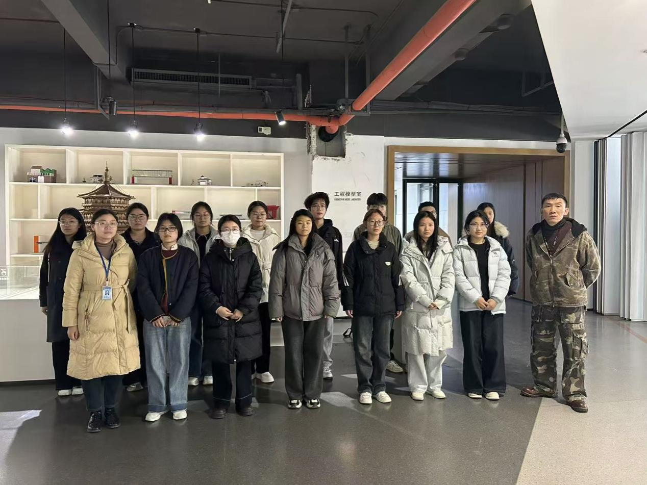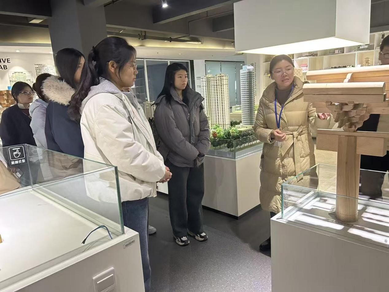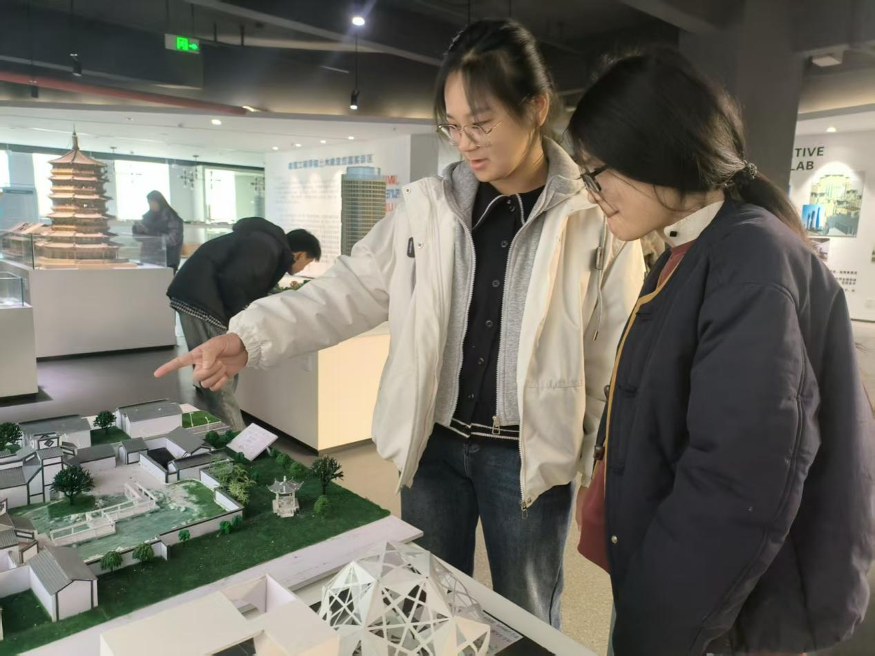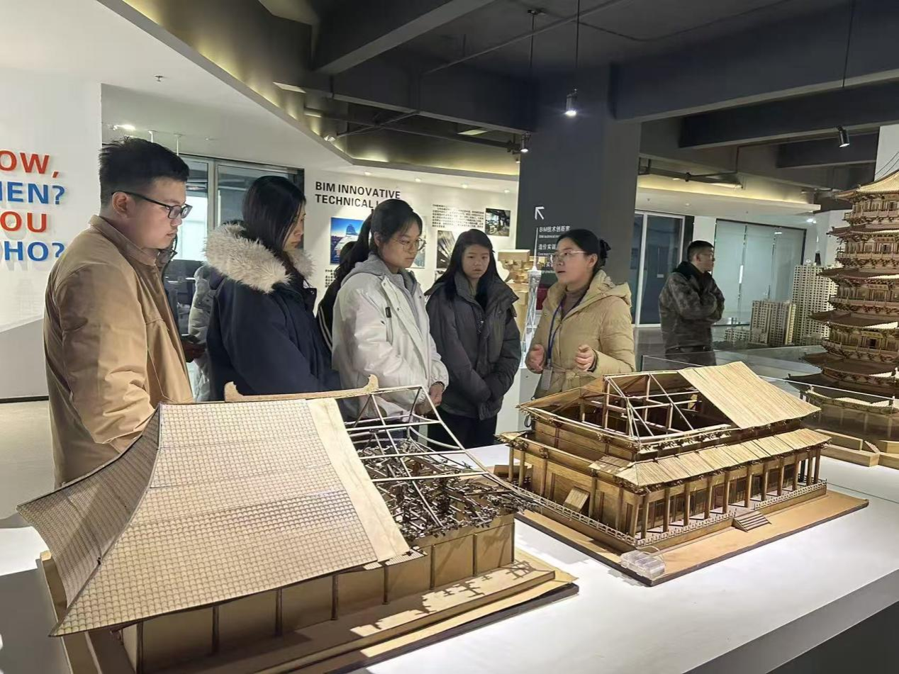 参观过程中,学子们热情高涨、互动频繁。大家时而驻足凝视榫卯构件的精密咬合结构,细致观察斗拱、雀替等传统建筑元素的工艺细节;时而围绕现代建筑模型的功能分区、结构选型展开热烈讨论,主动向老师请教BIM技术在模型构建中的应用要点。原本停留在课本中的建筑力学、空间设计、结构稳定性等专业概念,在与模型的近距离接触中变得具体可感,有效打通了理论学习与实践应用的“最后一公里”。