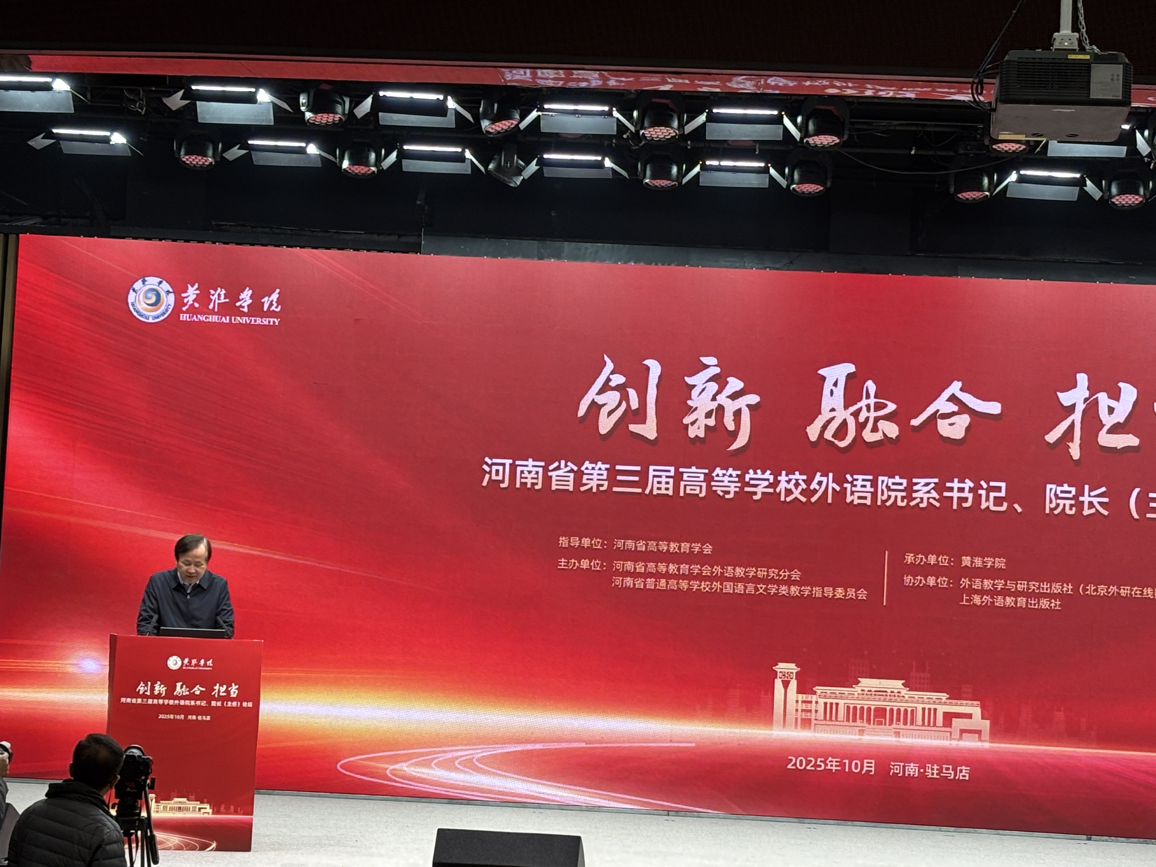 2025年10月24日至26日,河南省第三届高等学校外语院系书记、院长(主任)论坛在黄淮学院举行。本届论坛以“创新·融合·担当”为主题,汇聚全国外语教育界专家学者,共同探讨数智赋能外语教学改革、学科交叉融合与新时代外语人才的使命担当。外国语学院院长王莉莉教授、党委书记石皓召、副院长贺光辉副教授和骨干教师张保培应邀出席。