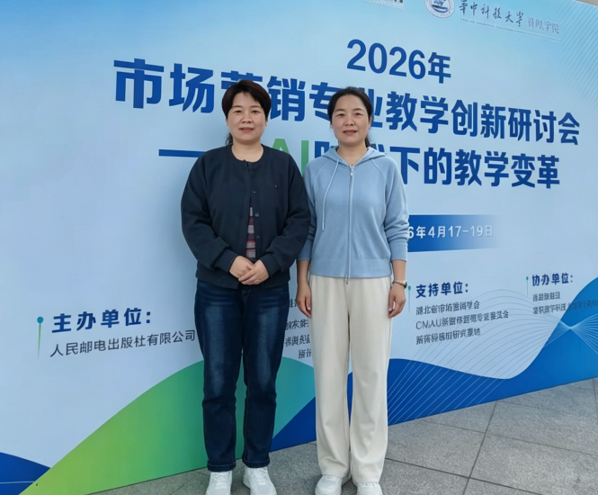 为进一步推动人工智能与教学创新全面深度融合,商学院霍秀珍、董园园两位教师参加了4月18日在华中科技大学管理学院成功举办的“2026年市场营销专业教学创新研讨会——AI时代下的教学变革”。两位参会教师与全国高校市场营销领域专家、骨干教师及业界代表共同探讨AI 技术赋能下的营销教学改革与人才培养创新路径。