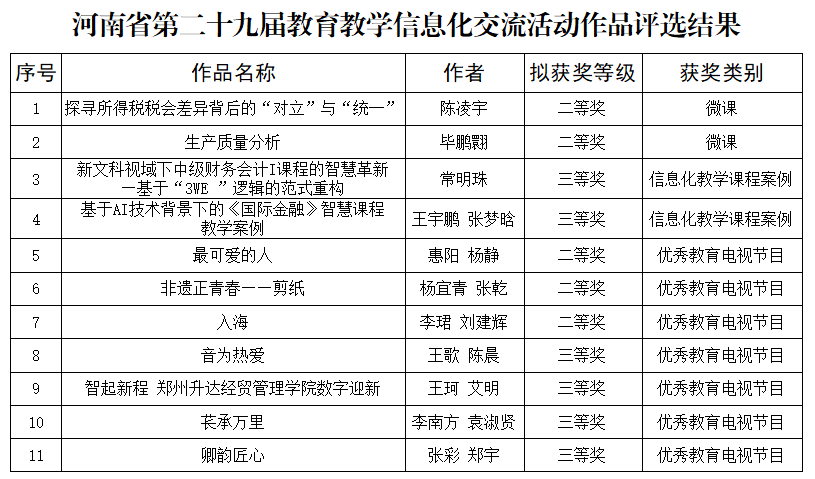 近日,河南省教育厅公布第二十九届教育教学信息化交流活动评选结果。我校教师表现优异、成果丰硕,共有 11 项作品经组委会评审获奖,具体名单如下: