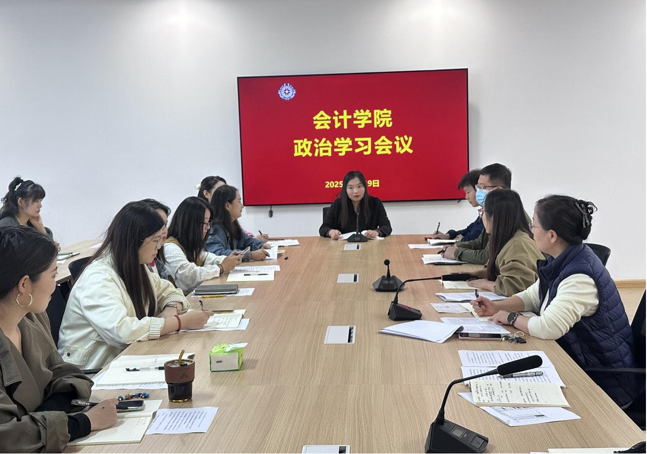 2025年9月19日,会计学院在4号楼209会议室组织集中政治学习。本次会议由学院党委书记张蕾主持,全体辅导员和组织员参加。
