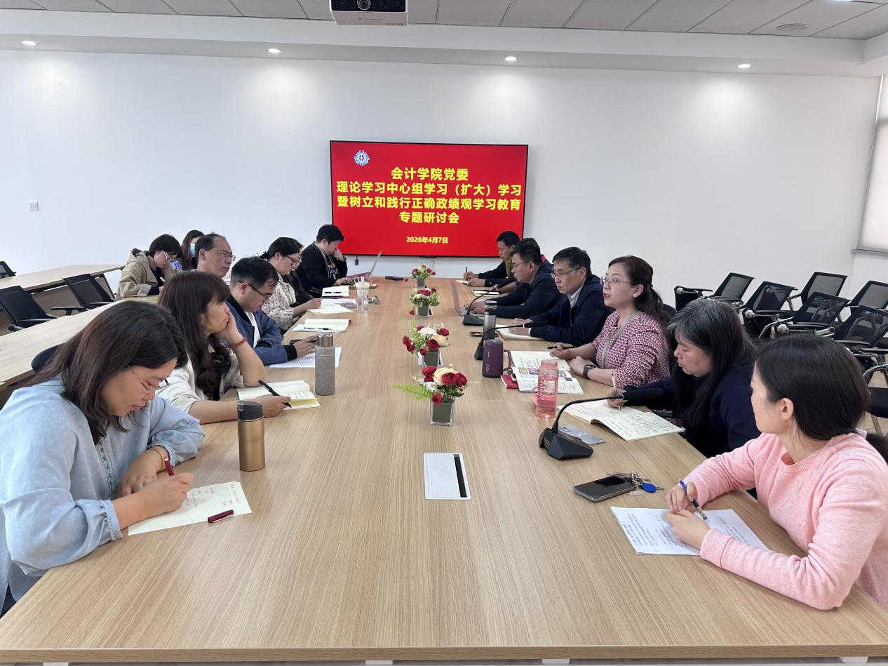 2026年4月7日,会计学院召开党委理论学习中心组学习暨树立和践行正确政绩观学习教育专题研讨会。会计学院党委理论学习中心组成员及教师党支部书记参加会议。会议由学院党委书记张蕾主持。