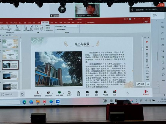 紧接着,2024届会计学专业校友徐梦豪通过线上形式做了报告。徐梦豪校友毕业当年考取哈尔滨商业大学会计专业硕士,并一次性通过2024年注册会计师全部六科考试,同时通过税务师四科考试、荣获河南省注册会计师协会“金榜考生”荣誉称号。他以自身为例向会计学子们分享学习经验,讲述个人在校经历及成果,以及如何规划好大学生活等。