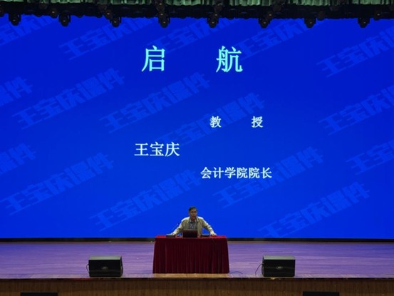 首先,由会计学院院长王宝庆教授为大家进行学院简介、专业知识教育等知识讲解。王宝庆教授用诙谐幽默的语言从会计学科的发展历程切入,结合数字化时代下“智能会计”“管理会计”的行业新趋势,用通俗的语言解读了专业课程体系与培养目标,为会计学院2025级新生明确了未来方向。