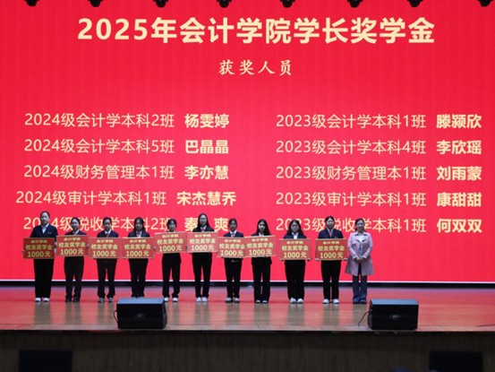 随后,举行了“会计学院学长奖学金”颁奖仪式。此奖学金由会计学院1996级校友刘东坡先生捐资设立,旨在奖励会计学院品学兼优的学生。本次是第二届,获奖学生共有10人,分别涵盖2023级、2024级会计学、财务管理、审计、税收四个专业。张蕾书记为获奖同学颁奖。