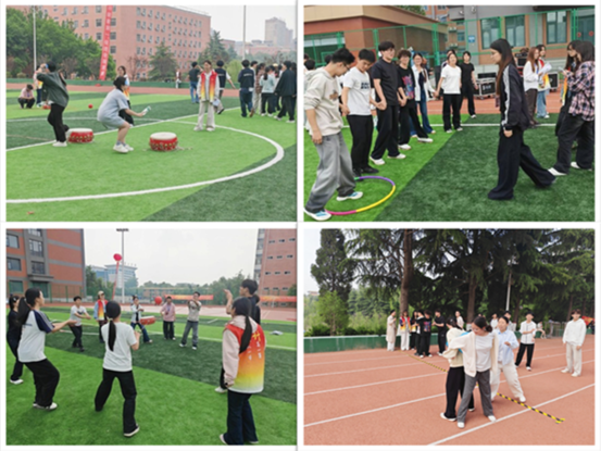 赛场上,“螃蟹背西瓜”“同心鼓颠球”“呼啦圈过山车”“趣味投壶”“旱地龙舟”“蒙眼击鼓”等趣味运动项目热烈进行。同学们热情高涨、默契配合,在“螃蟹背西瓜”中背对背夹球稳步前行、接力冲刺;在“同心鼓颠球”中齐心协力、节奏一致,尽力让皮球稳稳跳跃;在“呼啦圈过山车”项目中手拉手紧密相连,依次传递呼啦圈,全程配合无间;在“趣味投壶”中凝神瞄准、从容投掷,展现沉稳心态;在“旱地龙舟”上脚步统一、口号响亮,协同向前奋力竞速;在“蒙眼击鼓”中听从指引、摸索前行,准确敲响目标,每一个项目都充满欢声笑语,尽显青春活力与团队凝聚力。