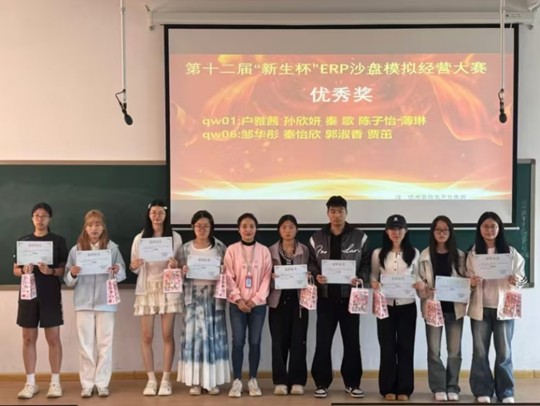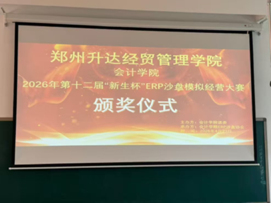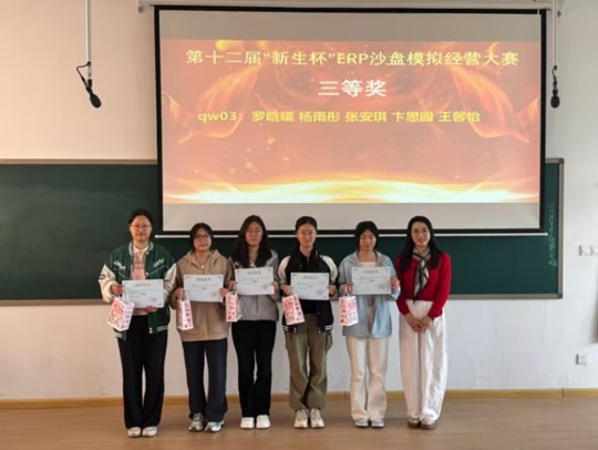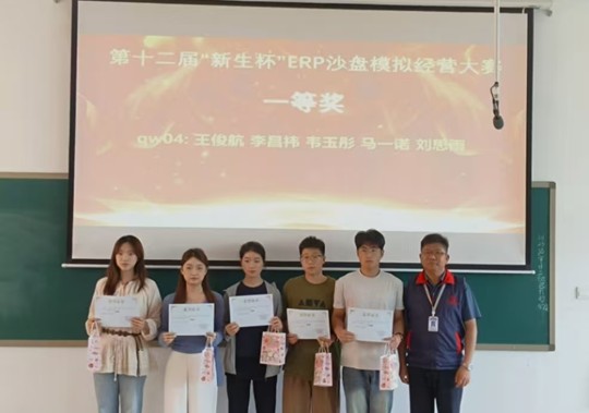 为提升会计学院学生实践能力与团队协作素养,4月18日至19日,由会计学院团委主办,会计学院社团管理中心ERP沙盘协会承办的第十二届“新生杯”ERP沙盘模拟经营大赛在商管大楼成功举办,并于4月23日在教学四号楼208教室举办本次比赛的颁奖仪式。会计学院党委副书记兼团委书记陈刚,团委副书记胡淑娟,ERP沙盘协会指导老师崔杰以及学院培训工作专员、辅导员刘冬莅临颁奖仪式现场。
