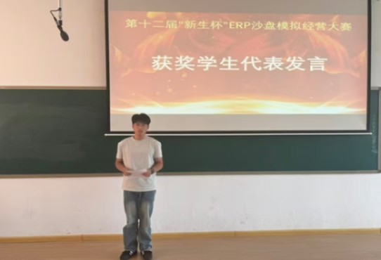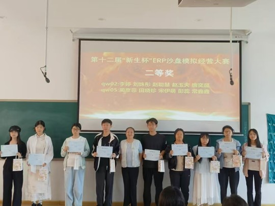 颁奖环节,刘东老师、胡淑娟老师、崔杰老师和陈刚老师分别为获得本次比赛优秀奖、三等奖、二等奖和一等奖的同学颁奖。获奖团队代表在分享心得时表示,此次大赛让大家真切体会到“知行合一”的重要性,在反复推演与实战对抗中,不仅熟练掌握了ERP沙盘运营技巧,深化了对财务管控核心的认知,更在团队协作中收获了成长与友谊,深刻认识到合理决策、高效配合对企业发展的重要意义。