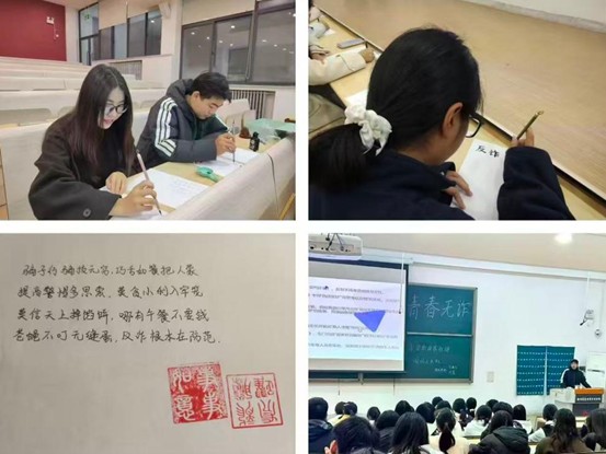 首先由零零欺反诈社团成员带来反诈情景剧,社长与副社长现场演绎诈骗案例,直观揭示常见骗局手段。其次,零零欺社长高嫄媛结合PPT与短剧视频开展案例知识讲座,对短剧中的骗局深入剖析。随后,国风人文社社长倪天宇讲述了:历史中的反诈和防诈故事,在生动有趣的历史故事中揭示古人的防诈骗意识和经验,并补充讲解不同类型的诈骗案例与防范技巧。最后,国风人文社成员在许震老师的带领下现场铺开纸张,同步创作反诈诗歌,以传统书法形式呈现反诈知识,朗朗上口的反诈诗歌便于同学们记忆。