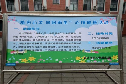 为缓解会计学院学生就业、考证等压力,增强心理调适能力与心理韧性,2026年3月26日,由会计学院团委主办、会计学院心航路社团承办的“植愈心灵,向阳而生”绿植心理健康主题活动在教学四号楼小广场举办。