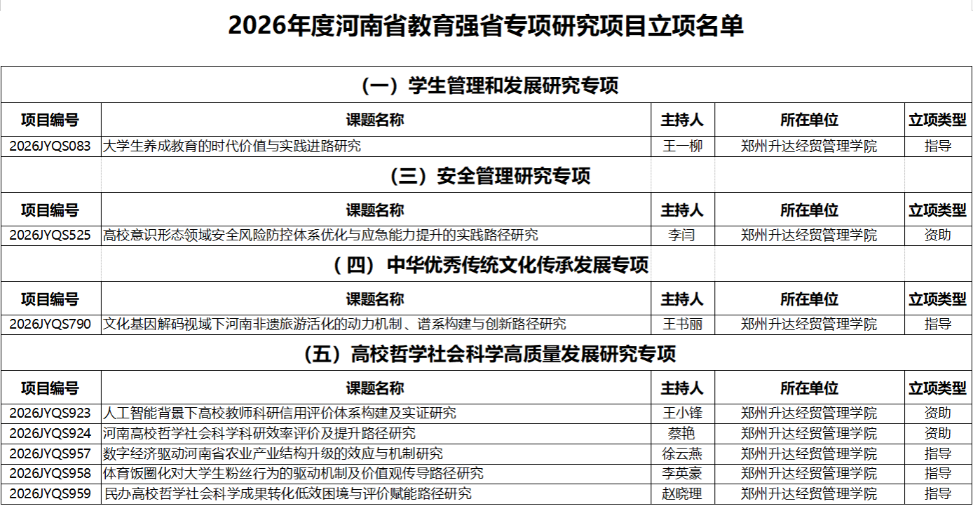 根据《中共河南省委教育工作委员会 河南省教育厅关于公布2026年度河南省教育强省专项研究项目申报工作的通知》(豫教工委办〔2025〕107号)文件通知,我校8项课题获批2026年度河南省教育强省专项研究项目立项,其中资助性计划3项,指导性计划5项。