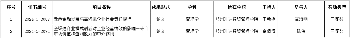 接河南省教育厅文件《中共河南省委教育工作委员会 河南省教育厅关于开展2024年度河南省高校人文社会科学优秀成果评定工作的通知》(豫教工委〔2025〕95 号),我校2项成果获奖,2项均为“年度成果奖”三等奖。具体信息如下: