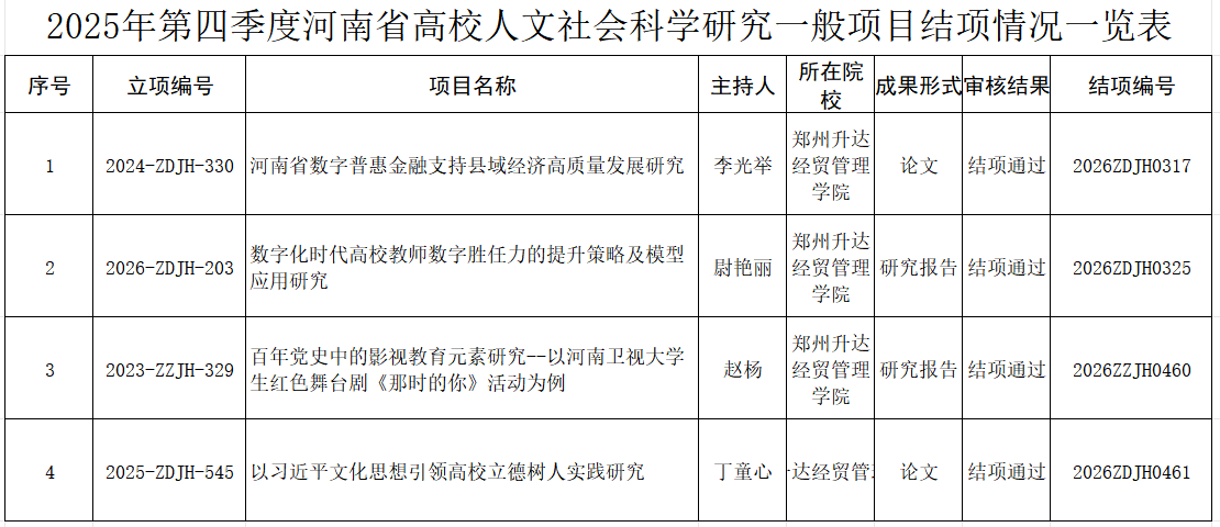根据河南省教育厅办公室《关于公布2025年第四季度河南省高校人文社会科学研究一般项目结项情况的通知》(教办社语〔2026〕15号)文件,我校四项课题获批结项。