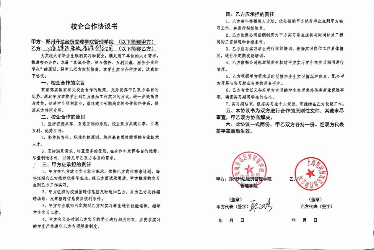 4月7日,我院行政秘书许广庆老师走访了上海锦河餐饮管理有限公司,并随后与之签署校企合作协议,正式成为郑州升达经贸管理学院管理学院实习教学基地共建单位,在人才互聘、交流与培训等方面建立全面合作。此次合作本着优势互补、资源共享的原则,为专业型人才培养搭建良好的平台。