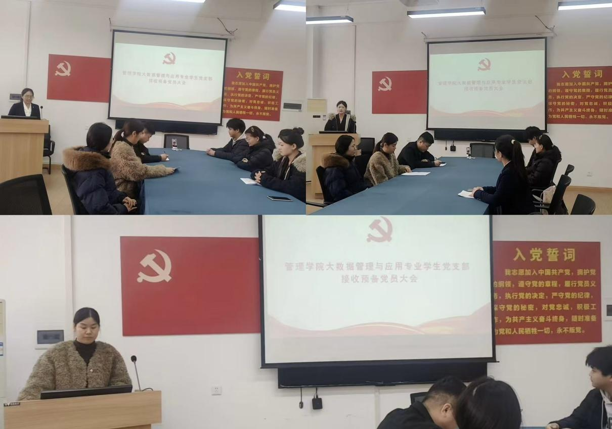 为进一步规范党员发展流程,落实党员发展细则,严把党员发展质量关,充分发挥党支部战斗堡垒作用。管理学院大数据管理与应用专业学生党支部于2025年11月27日12点在教学2号楼305会议室召开接收预备党员大会,讨论刘怡、韩梓轩两位同志的发展问题,支部全体党员参加本次会议。